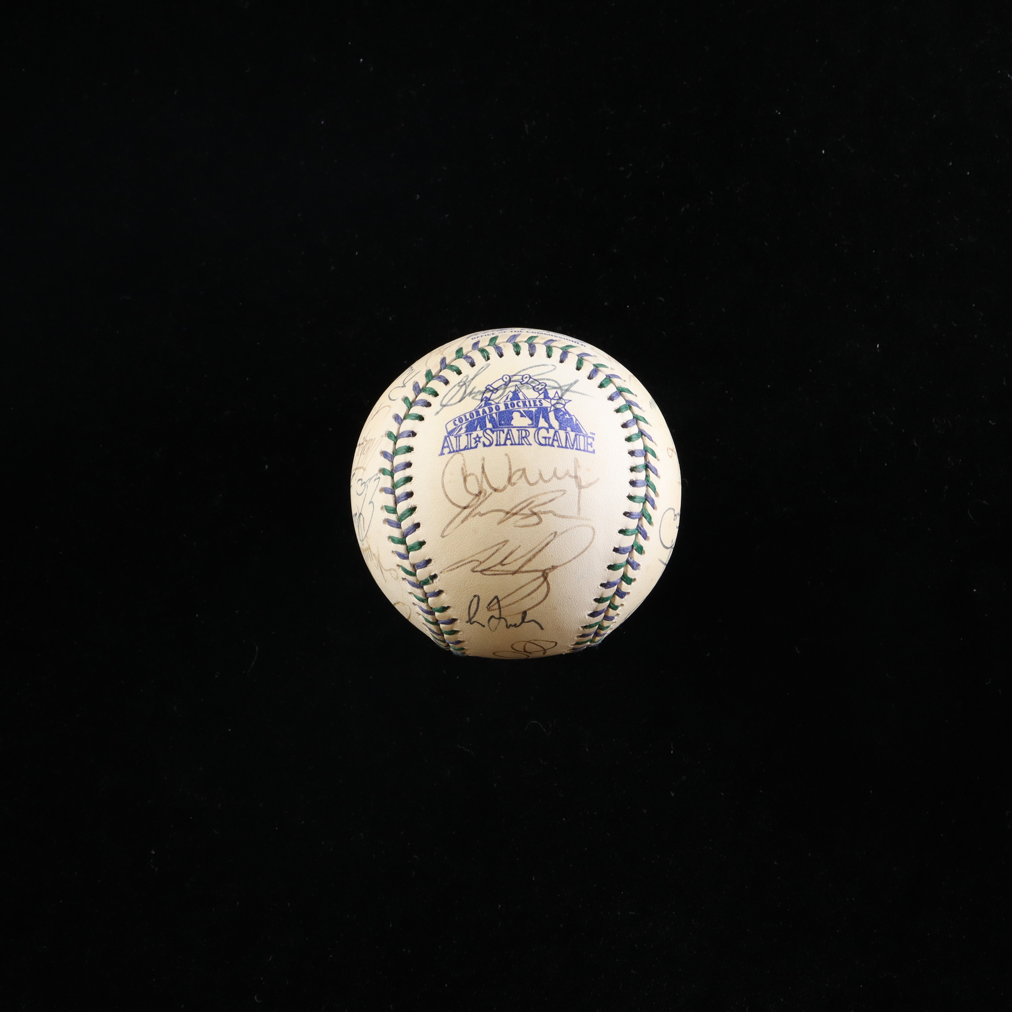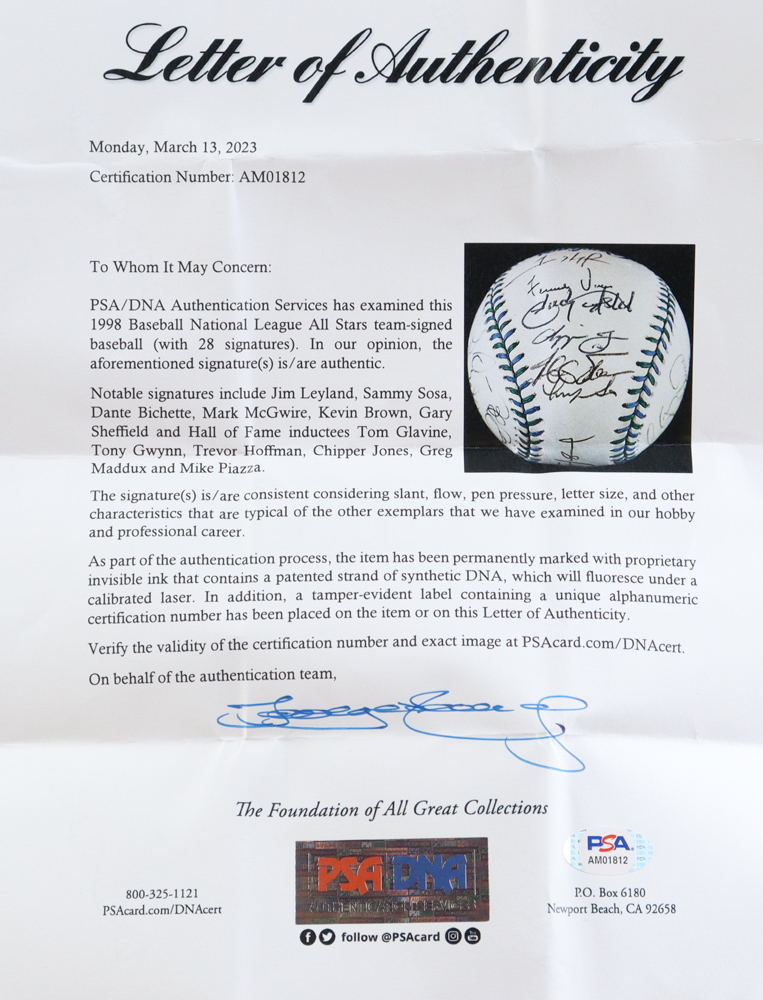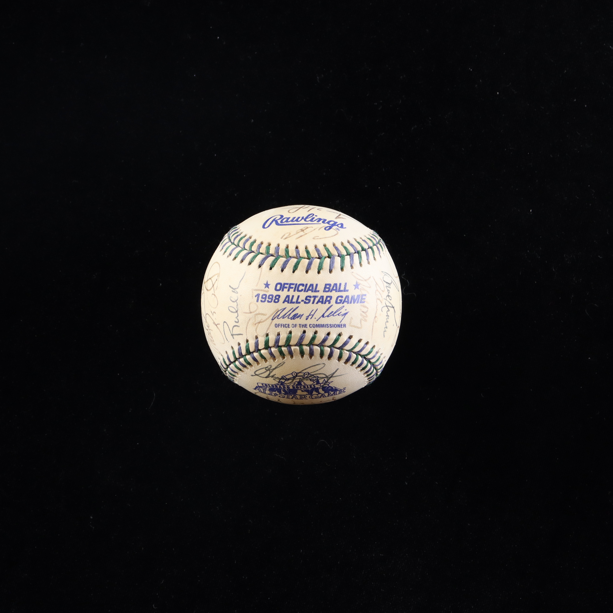 Rawlings Official 1998 All-Star Game baseball. Hand-signed by (28) with Jim Leyland, Sammy Sosa, Dante Bichette, Mark McGwire, Kevin Brown, Gary Sheffield, Tom Glavine, Tony Gwynn, Trevor Hoffman, Chipper Jones, Greg Maddux, Mike Piazza and (16) others.