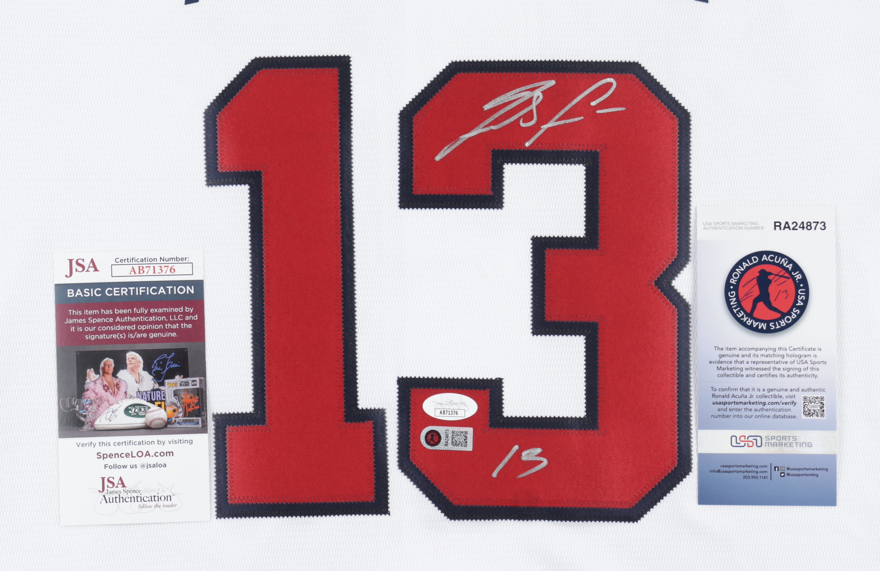 The autograph includes an official James Spence Authentication (JSA) hologram and matching COA as well as an official Ronald Acuna Jr. player hologram and matching COA for authenticity purposes.
