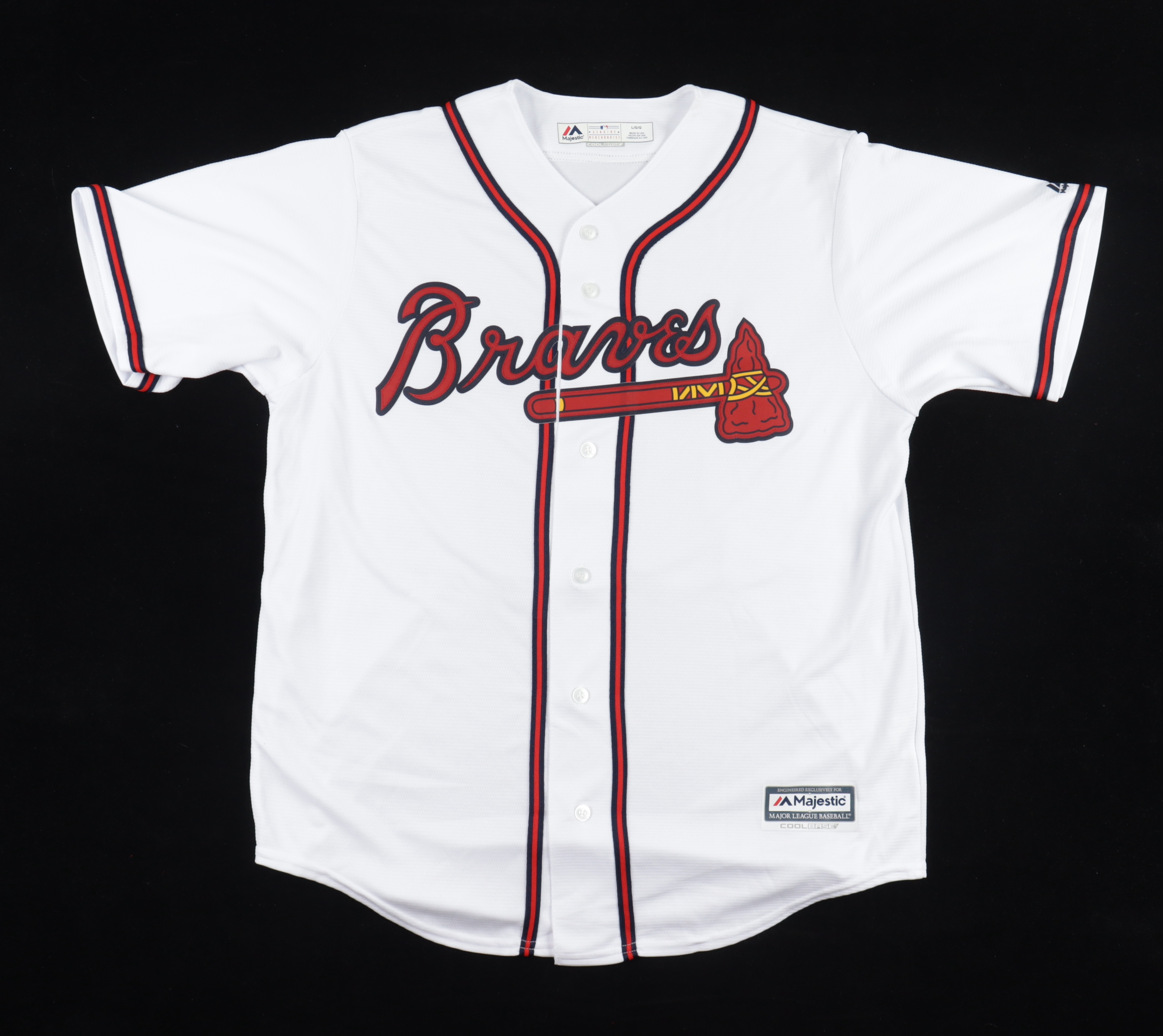Majestic on-field style jersey. Everything is printed on, size L. Has been hand-signed by Ronald Acuna Jr. (Atlanta Braves).