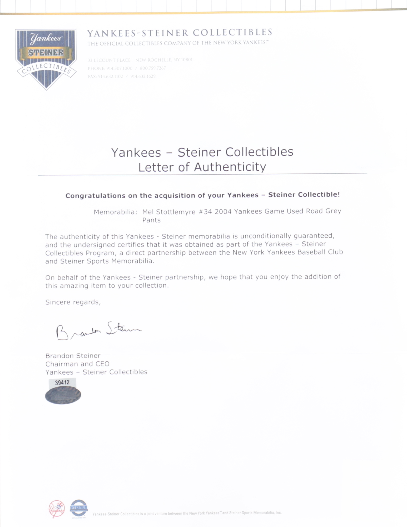 Authentication: Steiner Hologram & Yankees LOA