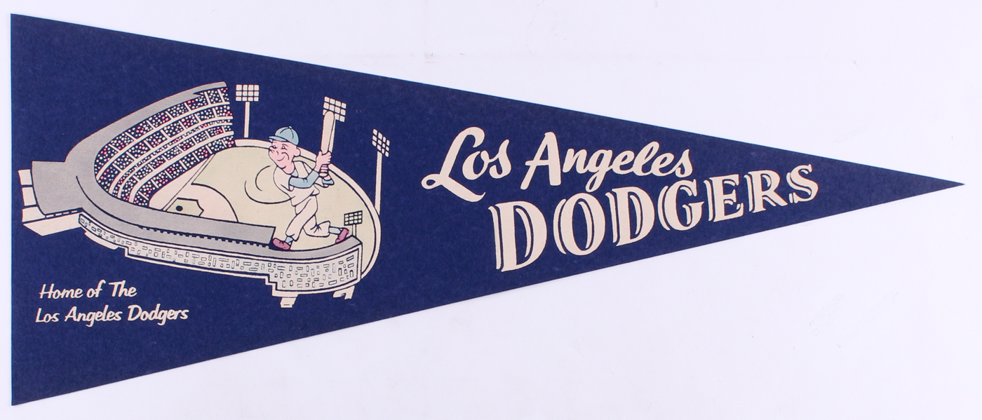 1960 Los Angeles Dodgers Pennant. The pennant flag measures approximately 30" long. Please note pennant shows signs of usage. Please see photos for more details regarding the condition pennant.