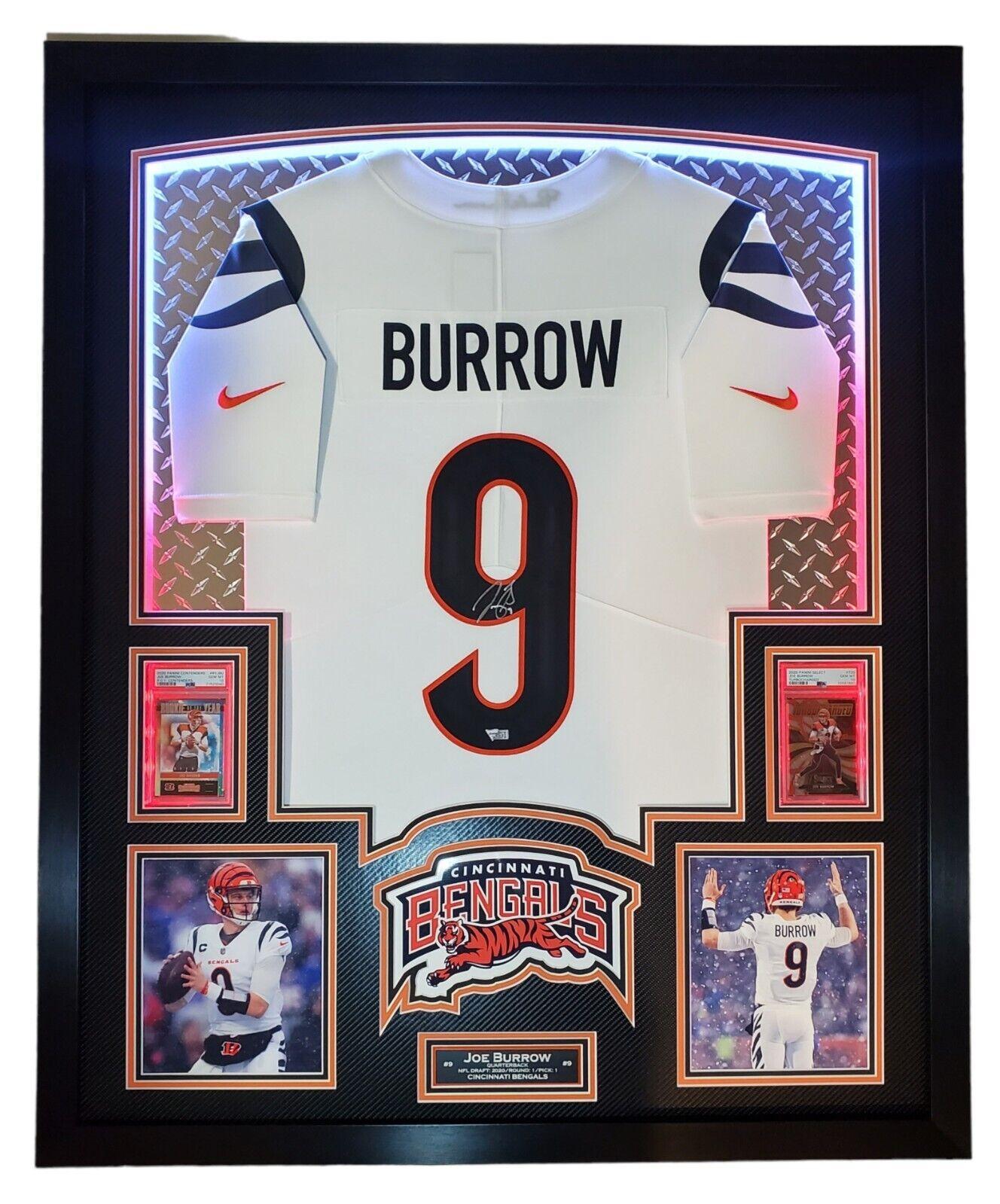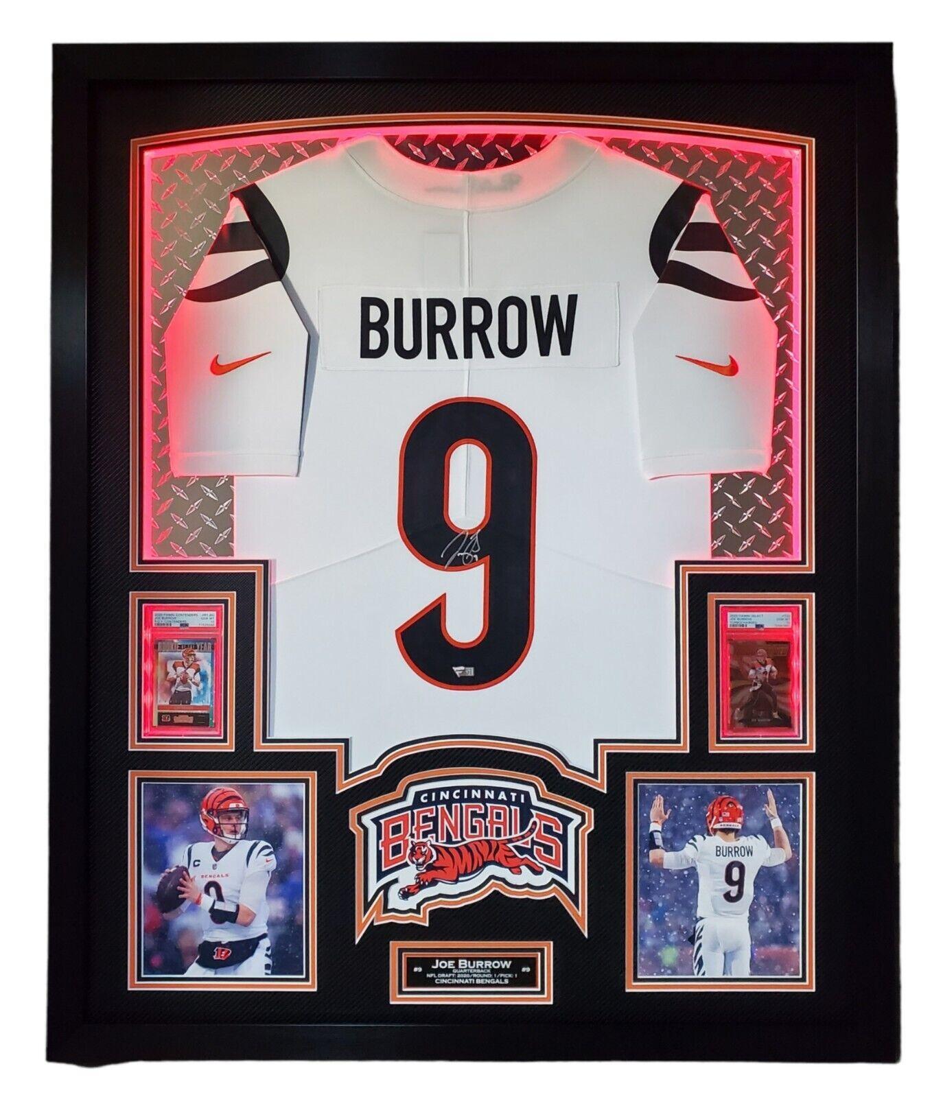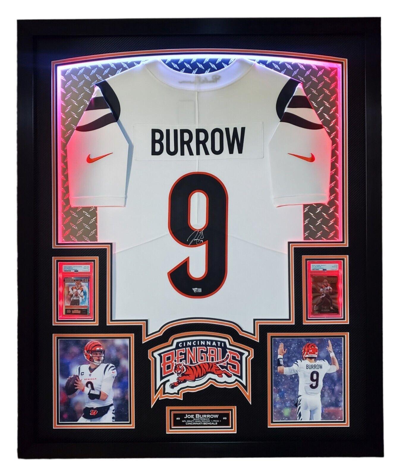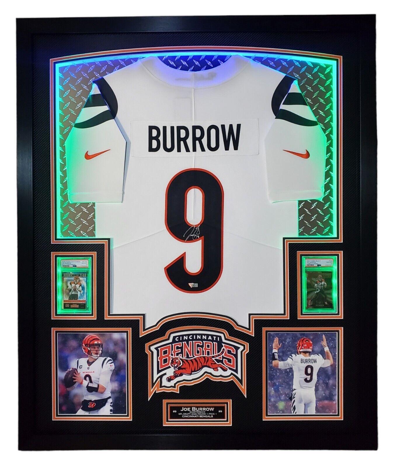 Joe Burrow Signed Bengals 33x42 Custom Framed Jersey Display with LED Lighting with 2020 Panini Contenders #RYJBU RC (PSA 10) & 2020 Panini Select #T20 RC (PSA 10) (Fanatics)