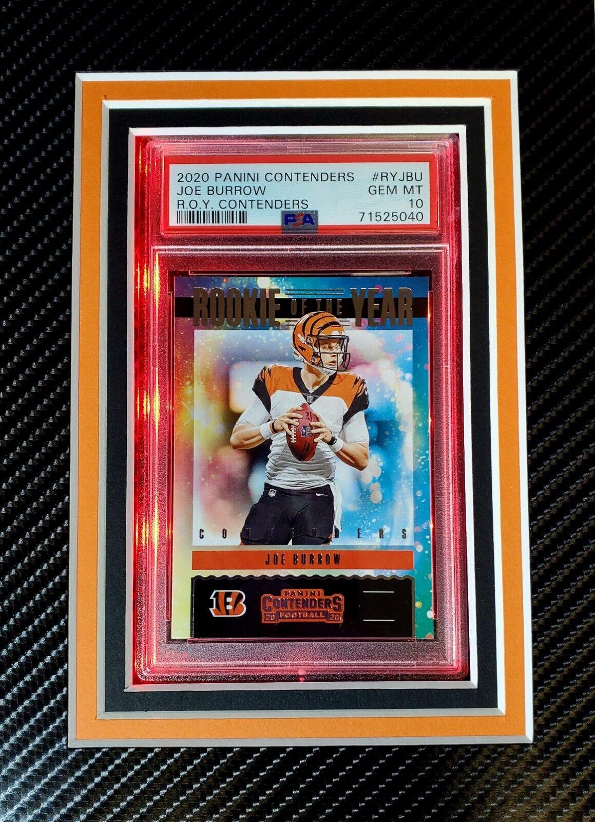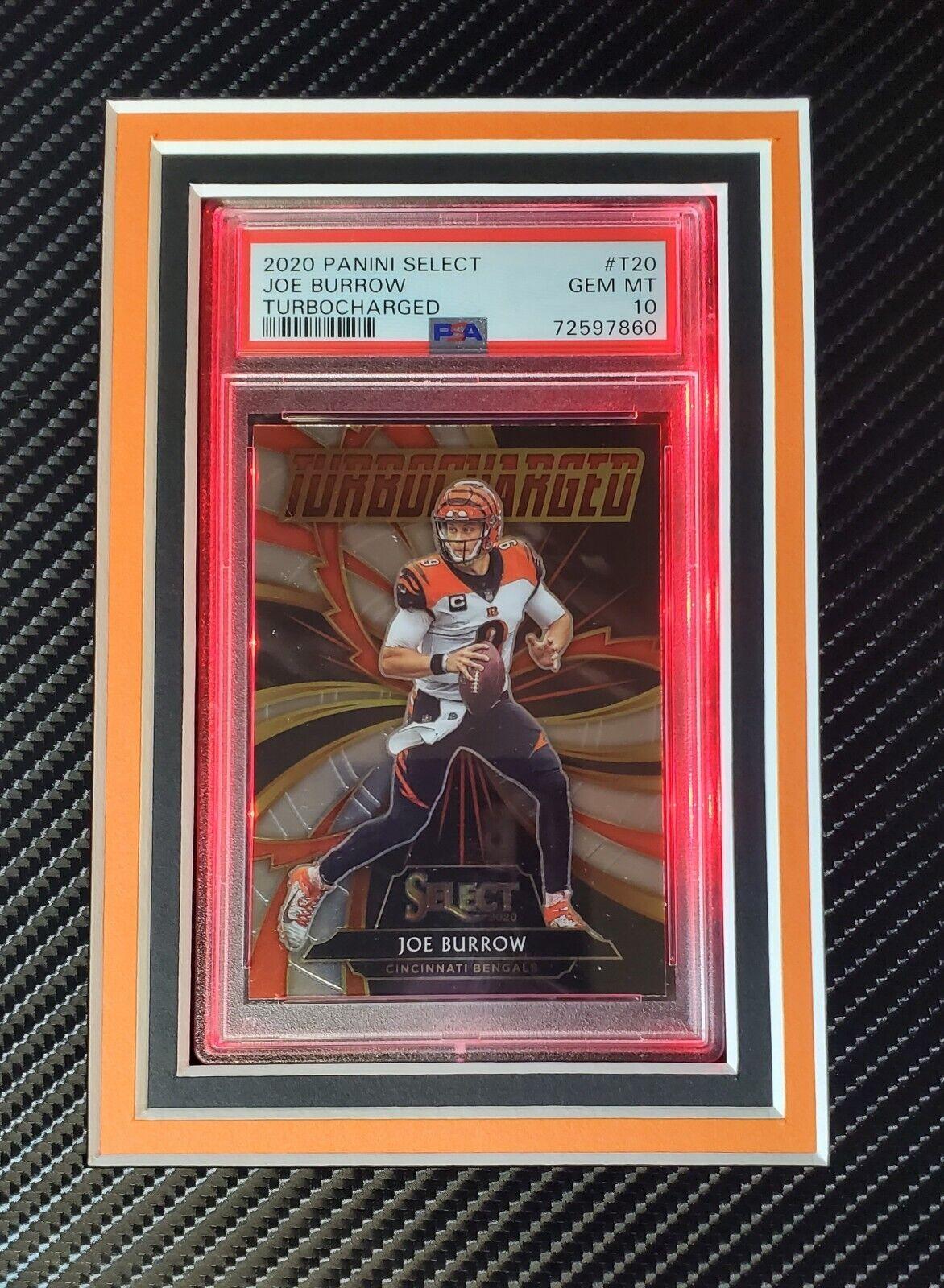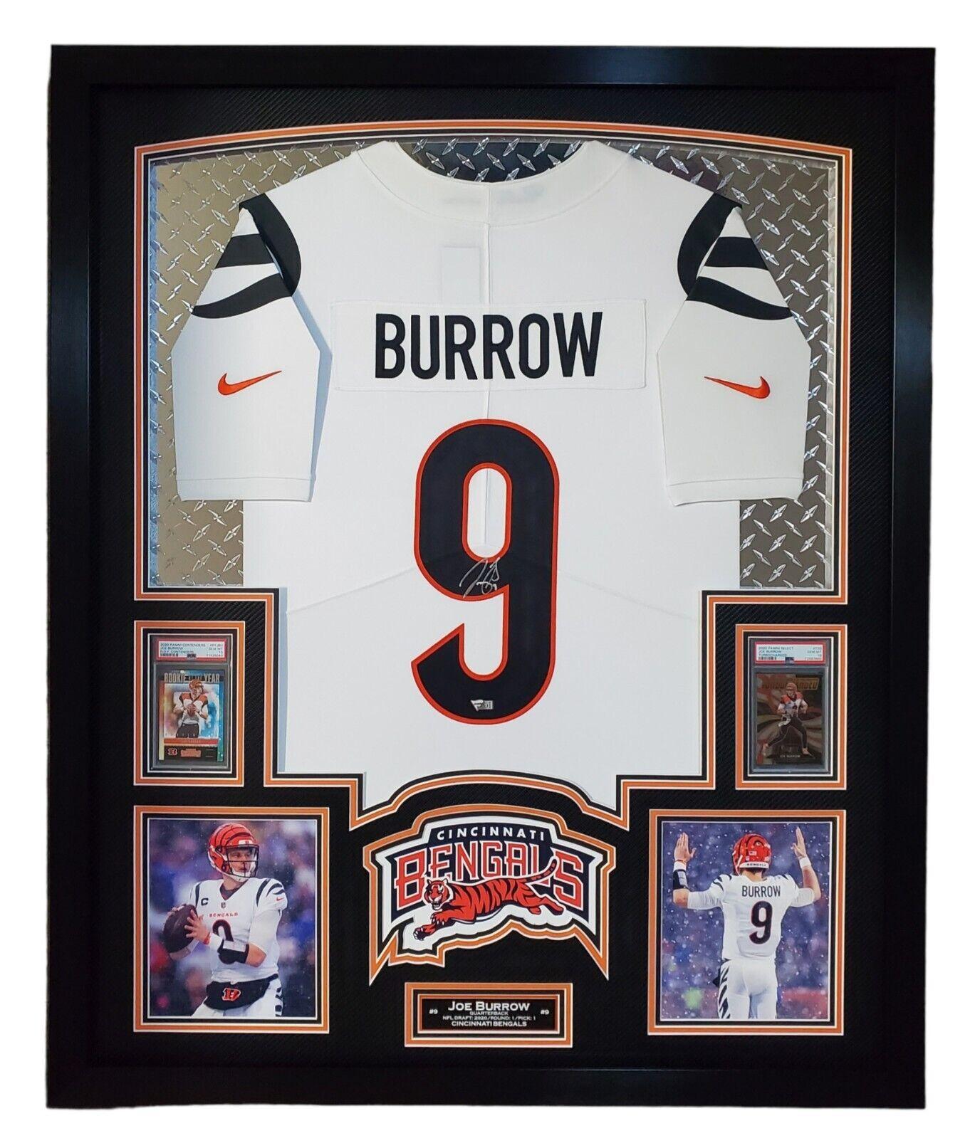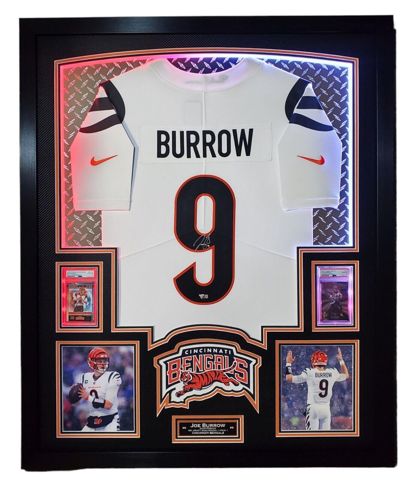 Joe Burrow Signed Bengals 33x42 Custom Framed Jersey Display with LED Lighting with 2020 Panini Contenders #RYJBU RC (PSA 10) & 2020 Panini Select #T20 RC (PSA 10) (Fanatics)