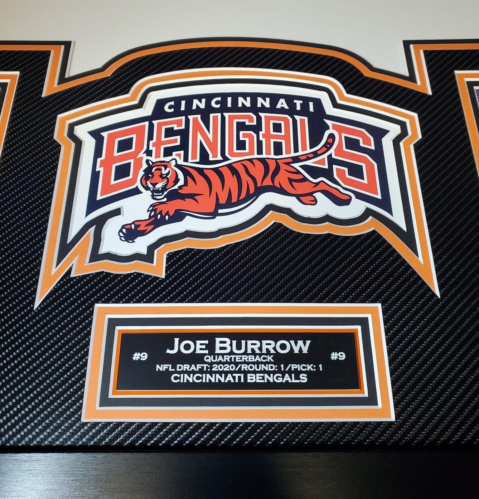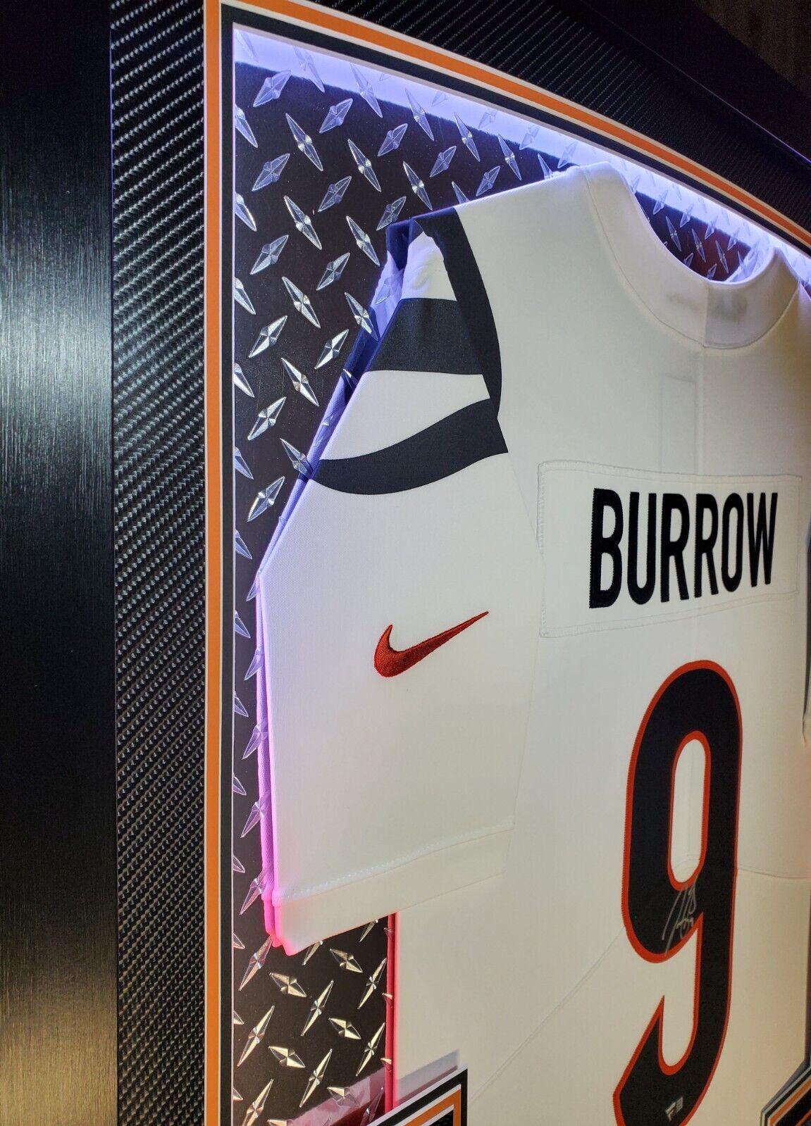 Custom frame LED back-lit display measures 42"x 33" in size. Features a Nike Limited style jersey that has been hand-signed by Joe Burrow (Cincinnati Bengals).