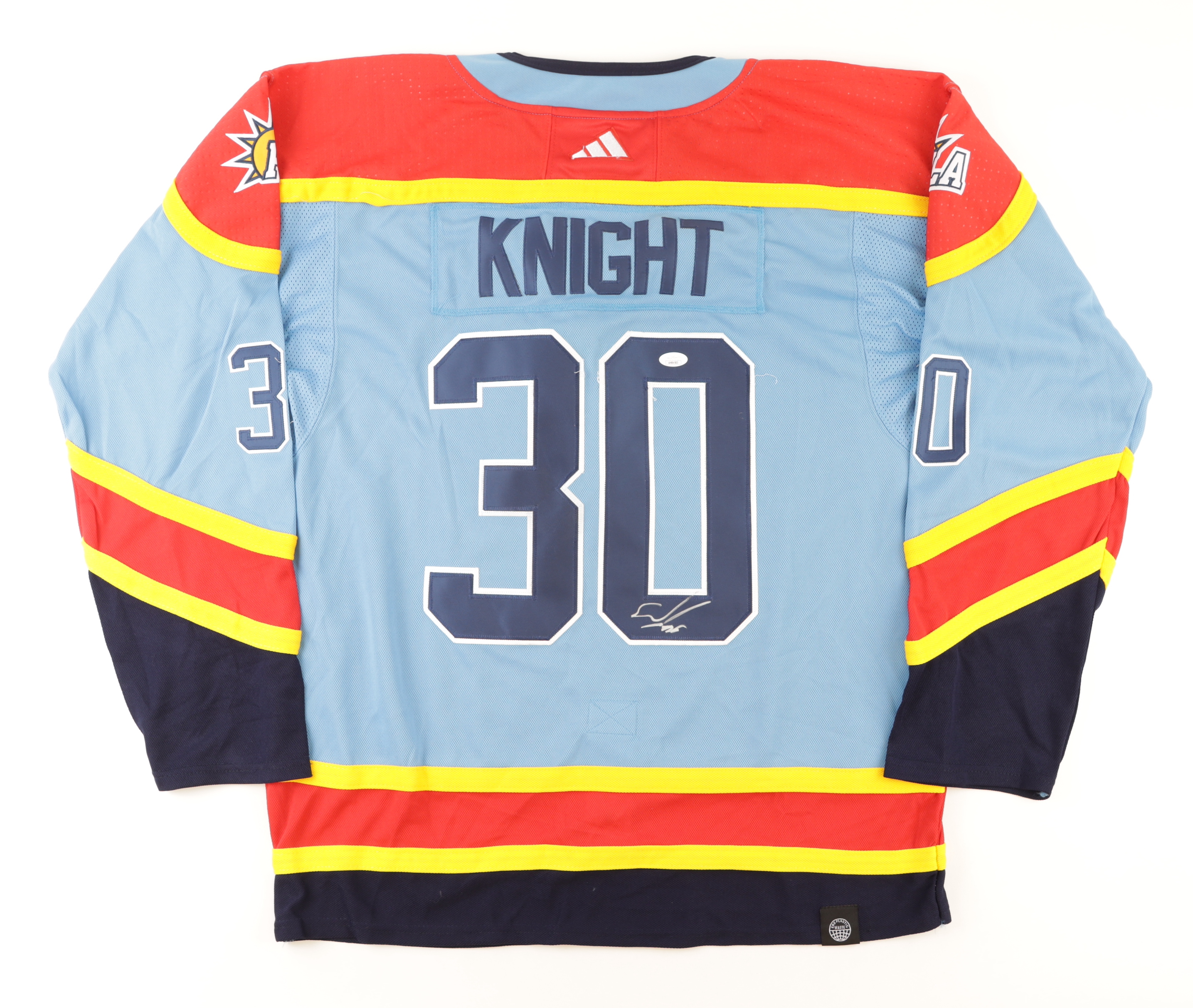 Adidas on-ice style jersey. Everything is sewn on, size 54. Has been hand-signed by Spencer Knight (Florida Panthers).