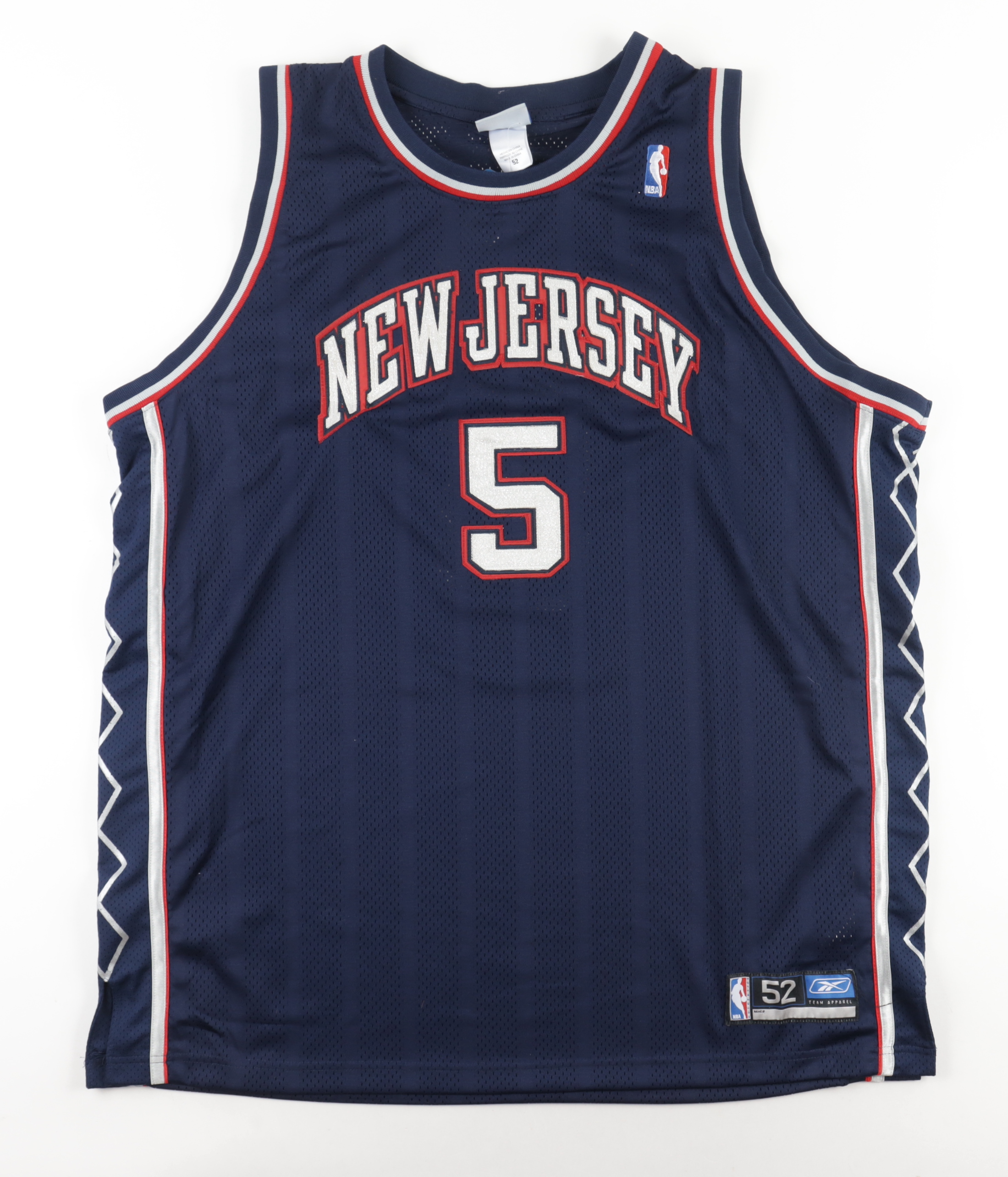Reebok on-court style jersey. Everything sewn on, size 52. Has been hand-signed by Jason Kidd (New Jersey Nets).
