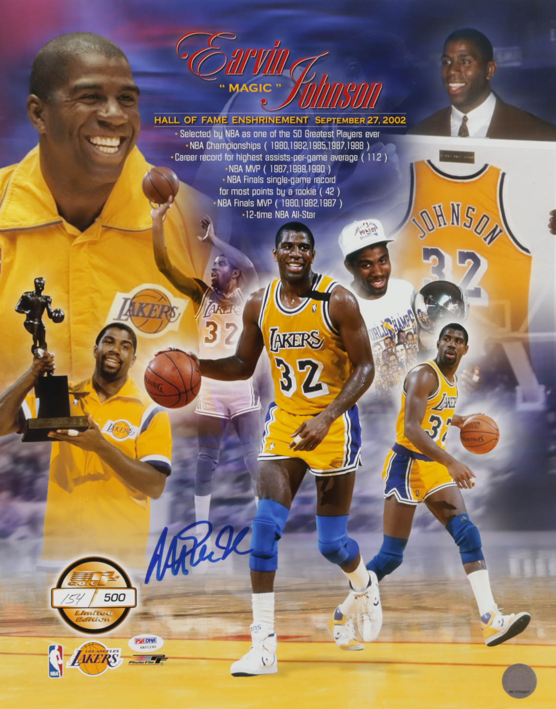 Photo measures 16" x 20" in size and has been hand-signed by Magic Johnson (Los Angeles Lakers, HOF). The photo is limited edition and has been numbered from a series of #/500.