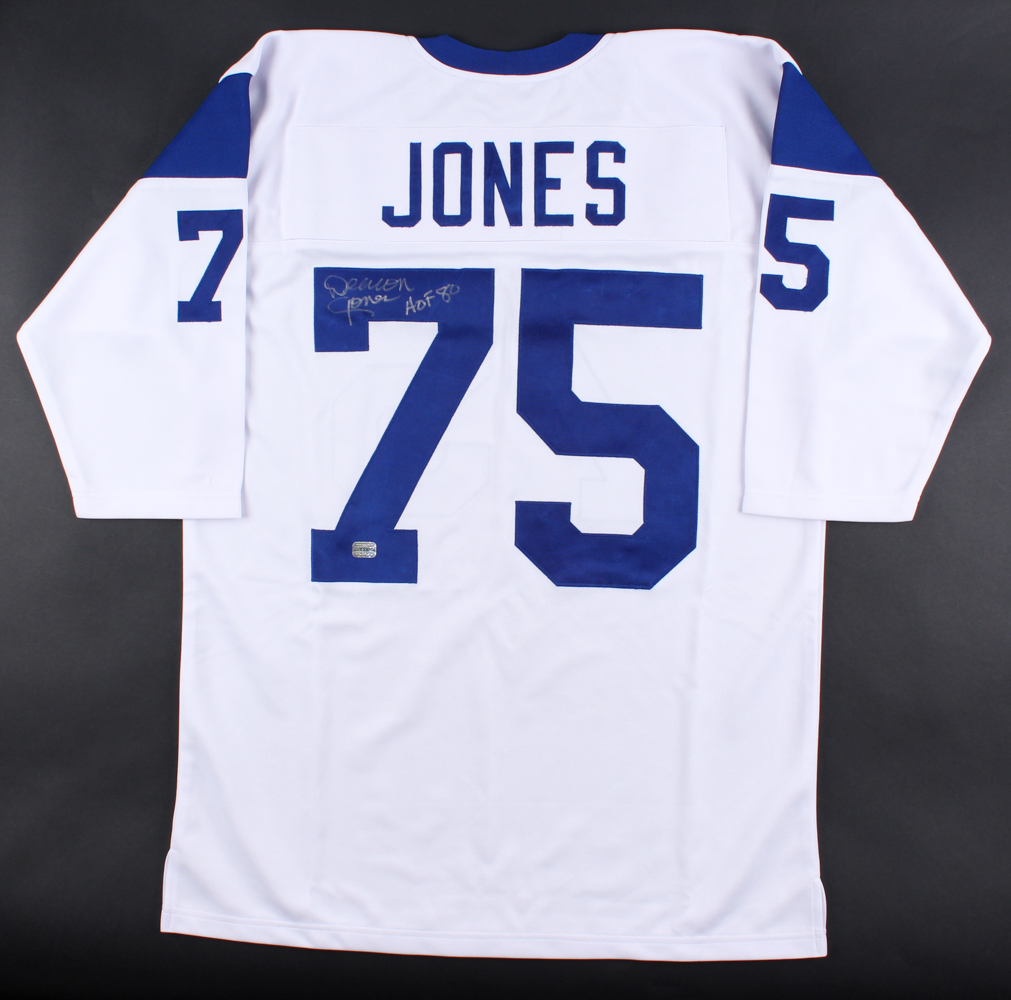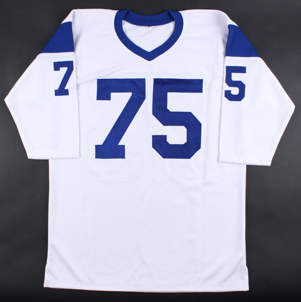 Custom on-field style jersey. Everything is sewn on, size 48. Hand-signed in silver paint pen by Deacon Jones (D. 2013, Rams, HOF).