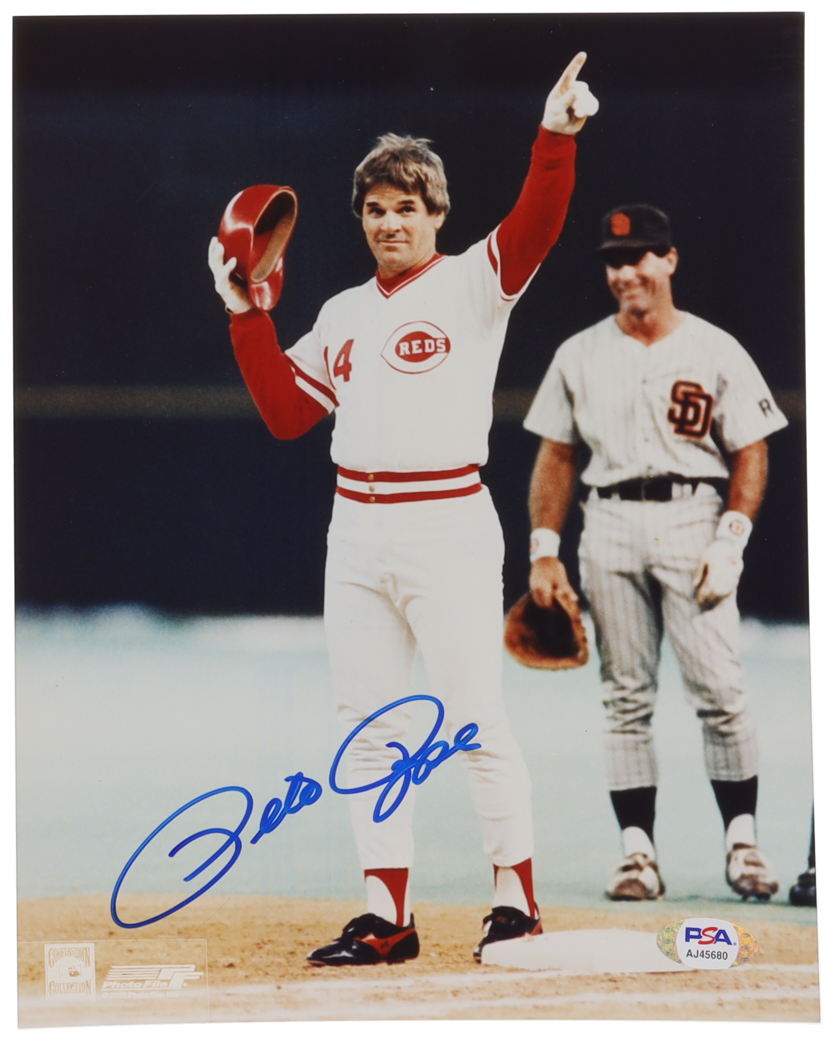 Photo measures 8" x 10" in size and has been hand-signed by Pete Rose (Cincinnati Reds).