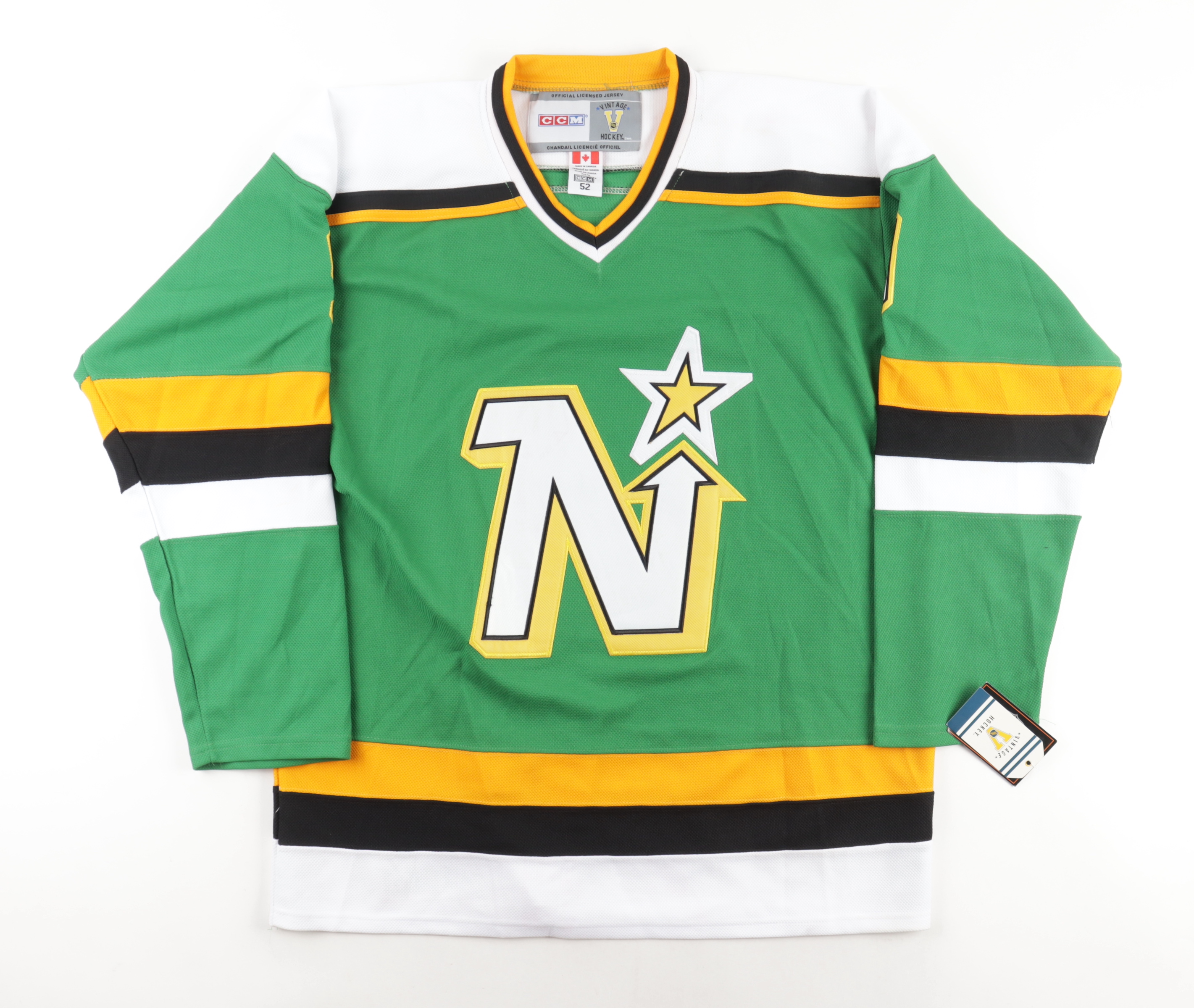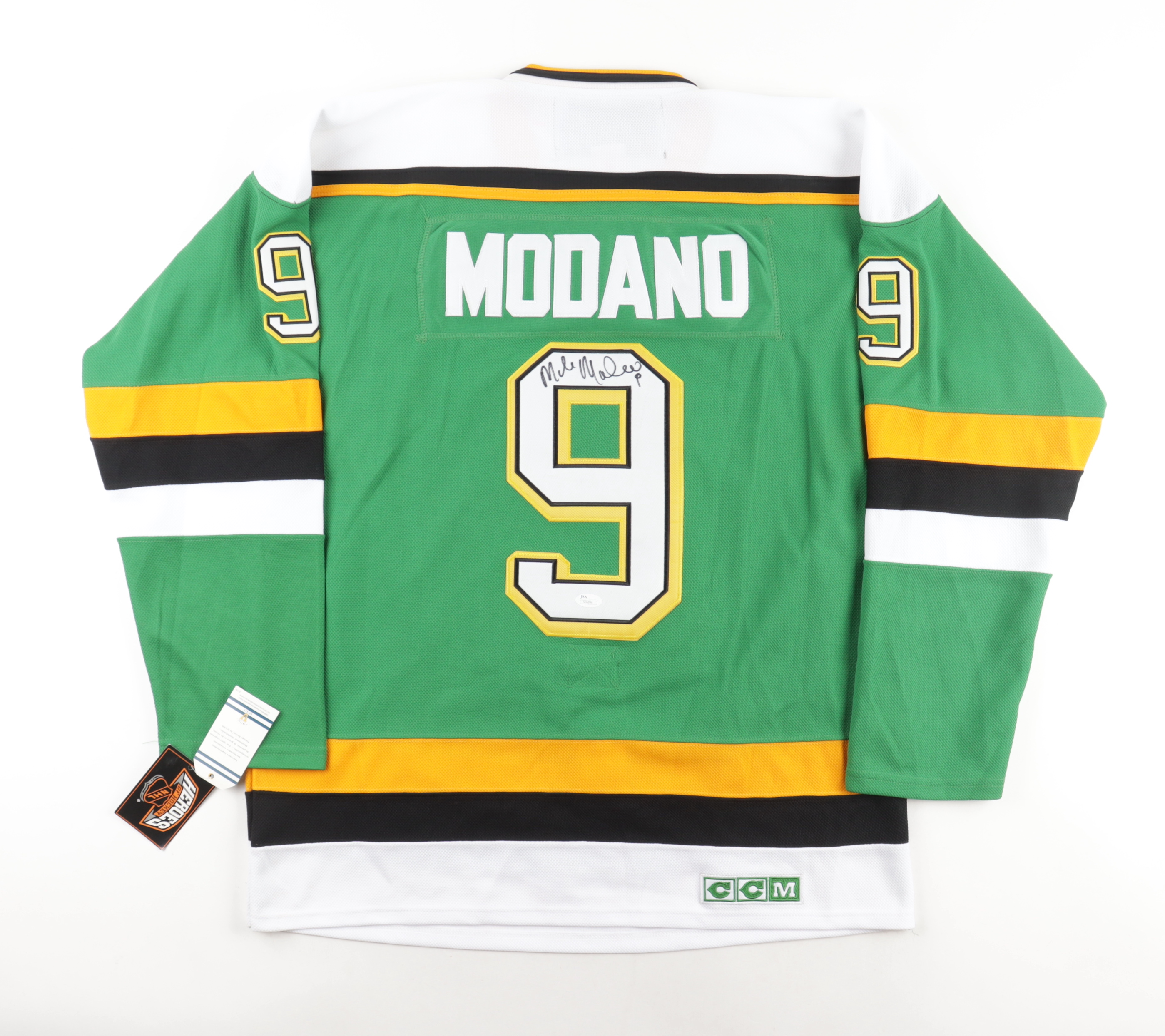CCM on-ice style jersey. Everything is sewn on, size 52. Has been hand-signed by Mike Modano (Minnesota North Stars, HOF).