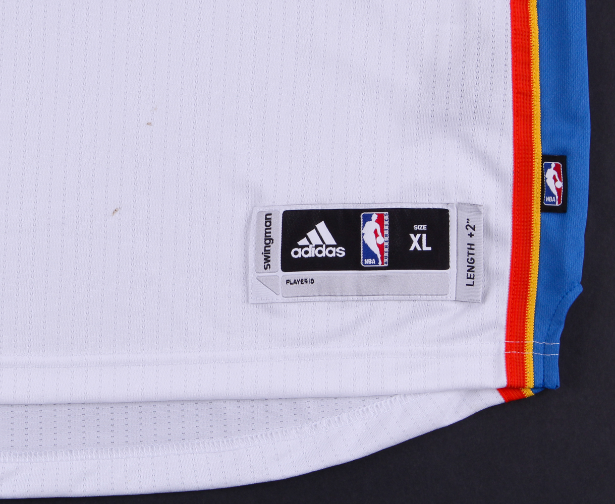Adidas Swingman jersey. Everything is silk-screened on, size XL. Hand-signed in silver paint pen by Kevin Durant (Warriors). Please note the jersey has a couple slight scuff marks near the bottom of the front side. See photos for details.