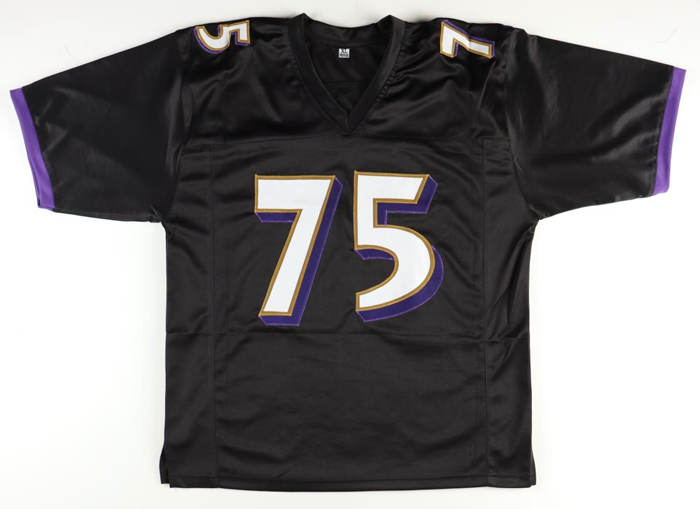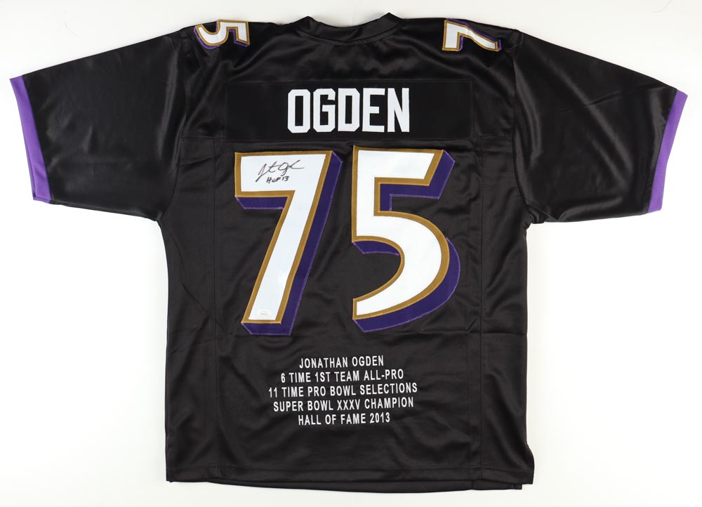Custom on-field style jersey. Everything sewn on, size XL. Hand-signed and inscribed by Jonathan Ogden (HOF). Ogden's career stats have been hand-stitched below the reverse numbers.
