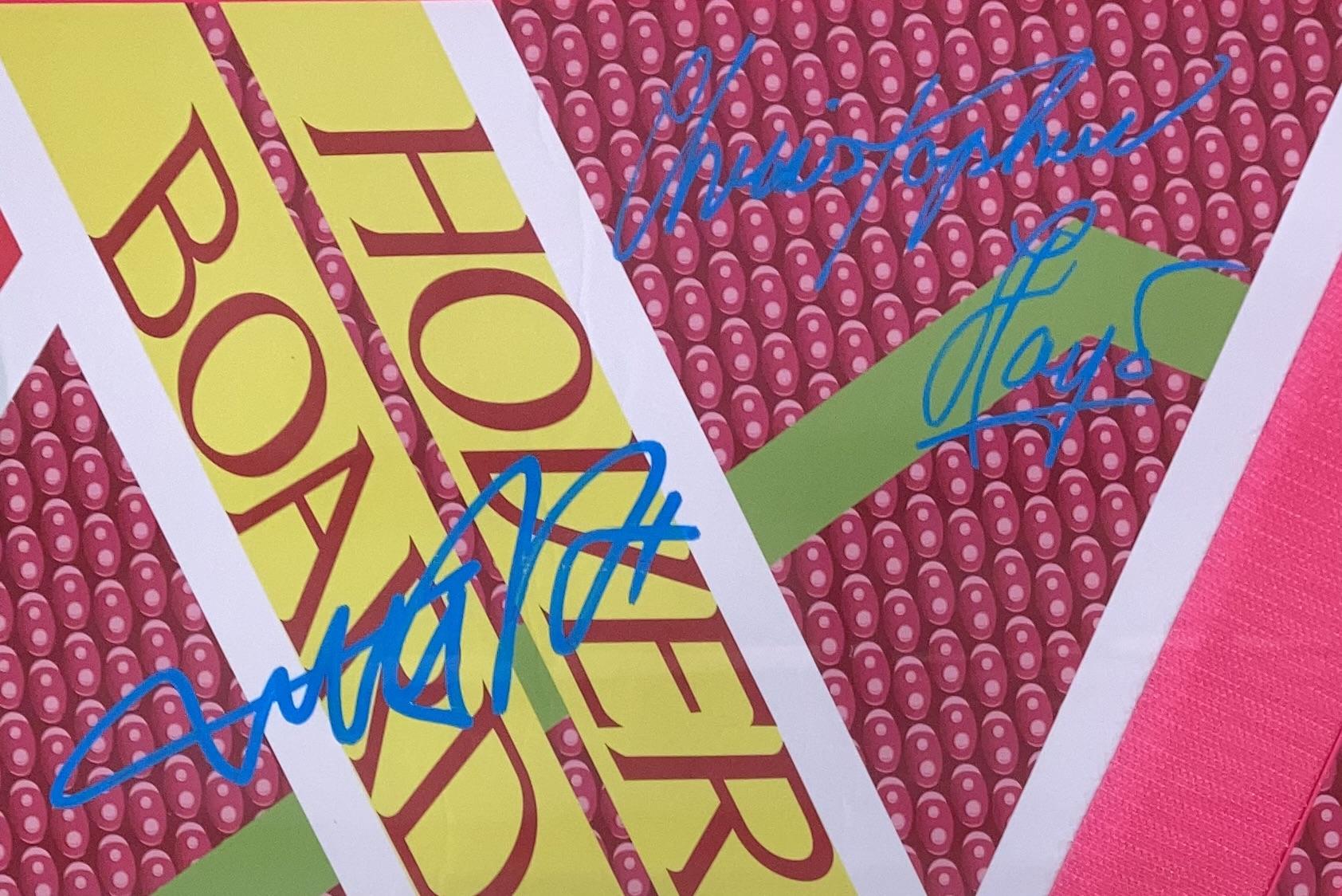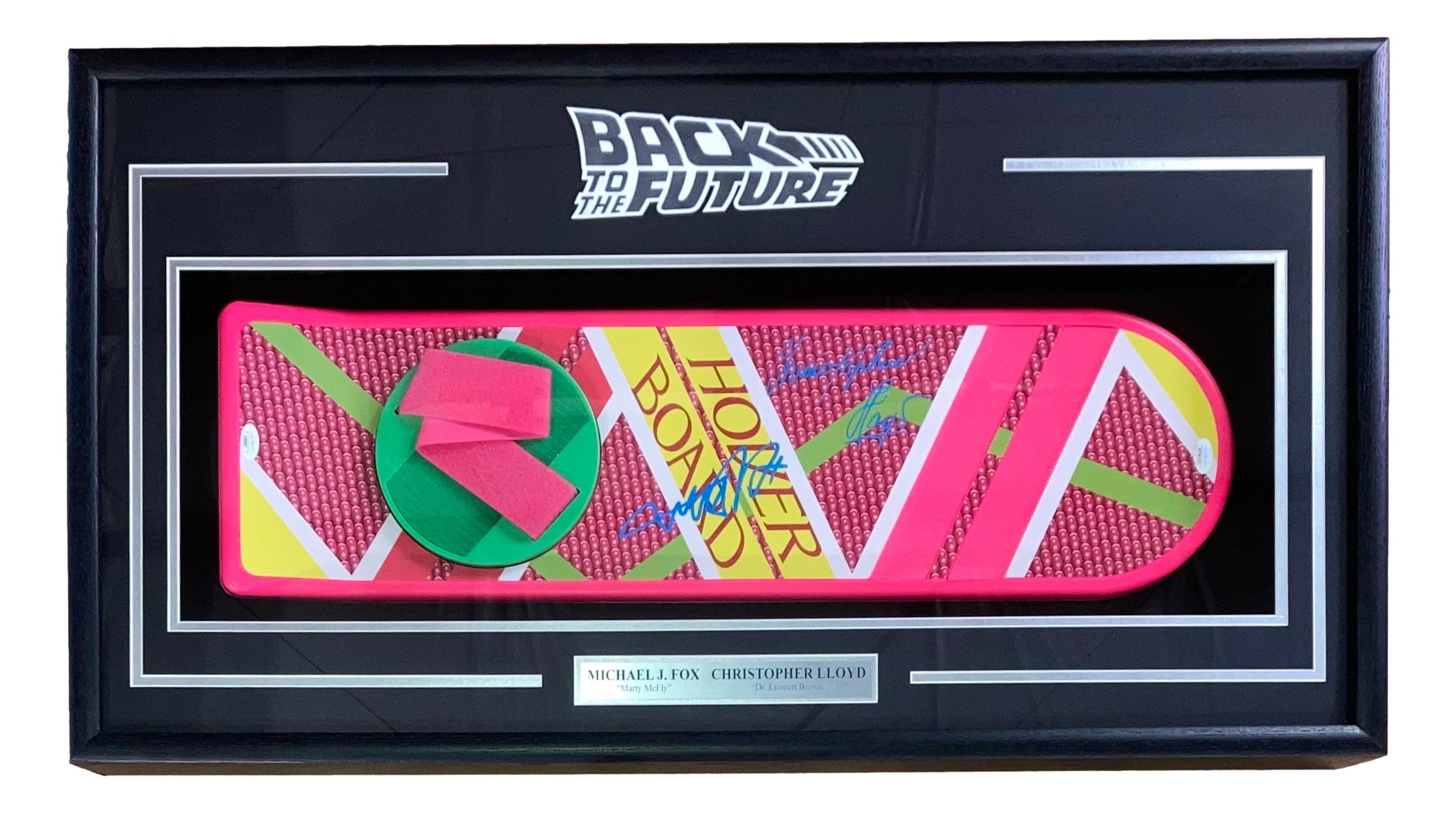 Custom frame measures 20" x 36" in size and features a full-size movie prop replica hoverboard. Hand-signed by Michael J. Fox (Marty McFly) and Christopher Lloyd (Doc Brown).