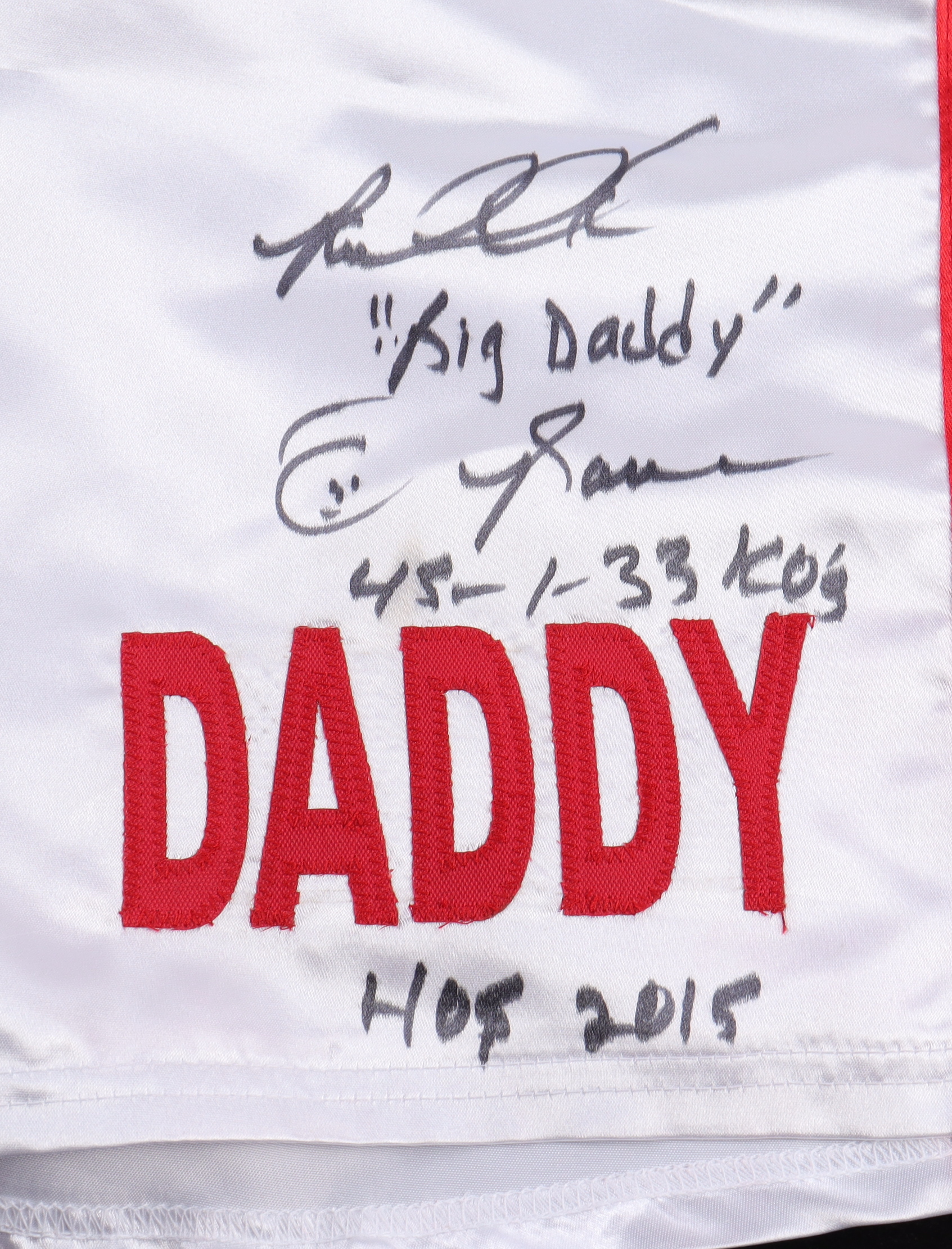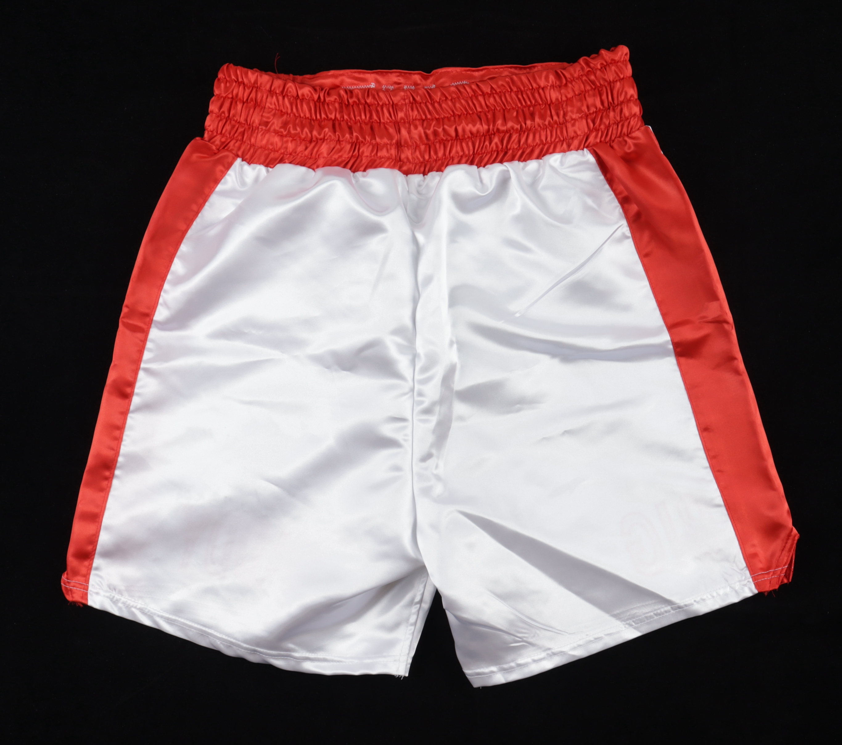 Custom boxing shorts have been hand-signed and inscribed by Riddick Bowe (HOF).