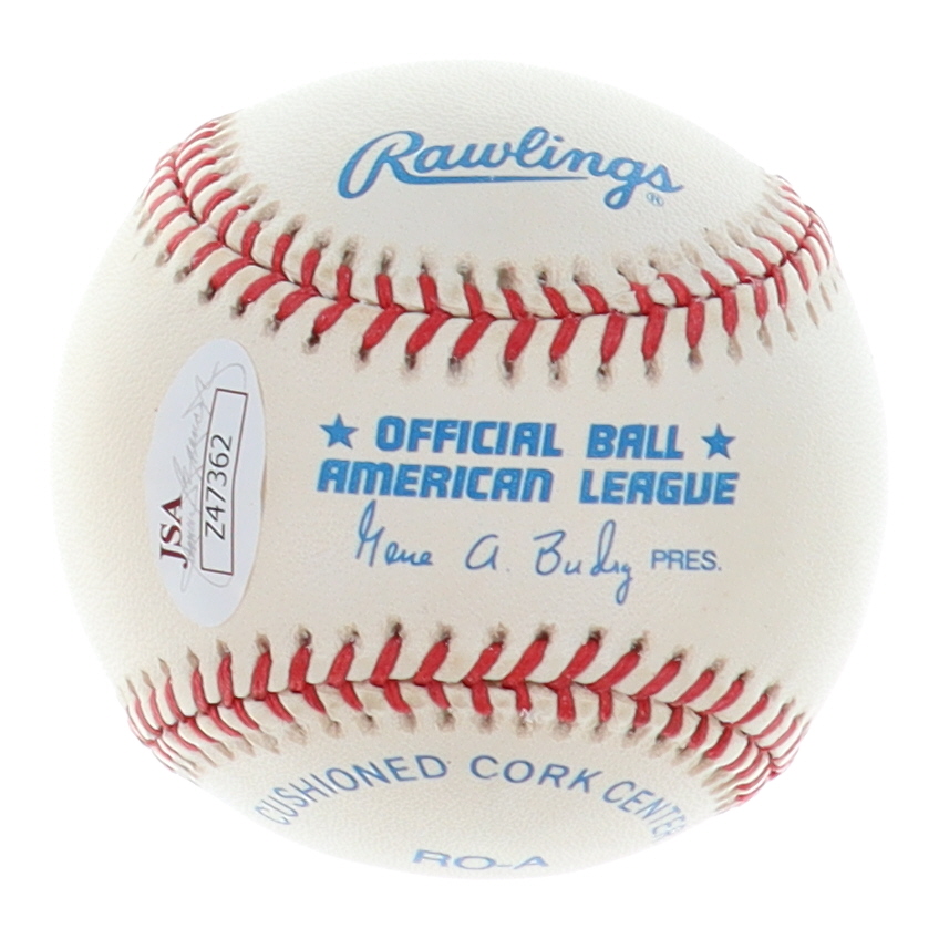 Rawlings Official American League baseball. Hand-signed and inscribed by Yogi Berra (D. 2015, New York Yankees, HOF). Berra has signed with his full-name.