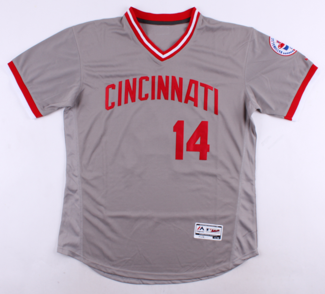Majestic Authentic on-field style jersey. Everything is sewn on, size 44. Hand-signed in black felt-tip pen by Pete Rose (Reds).