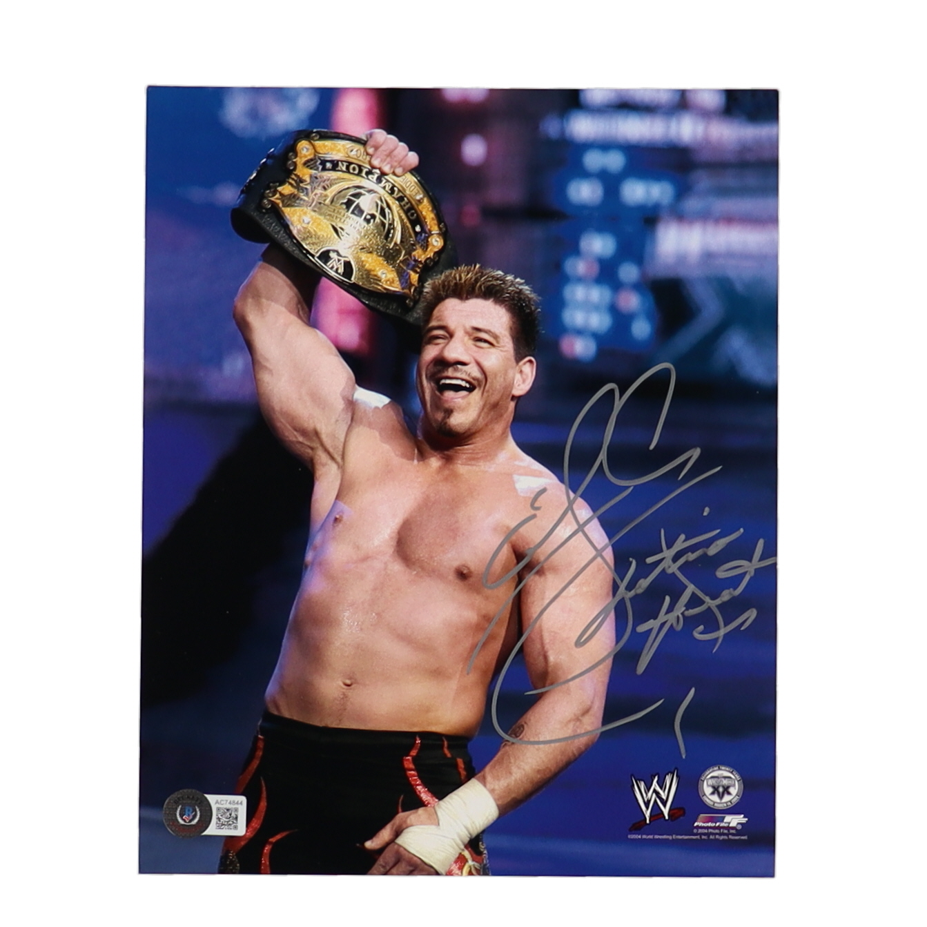Photo measures 8" x 10" in size and has been hand-signed and inscribed by Eddie Guerrero (D. 2005, HOF).