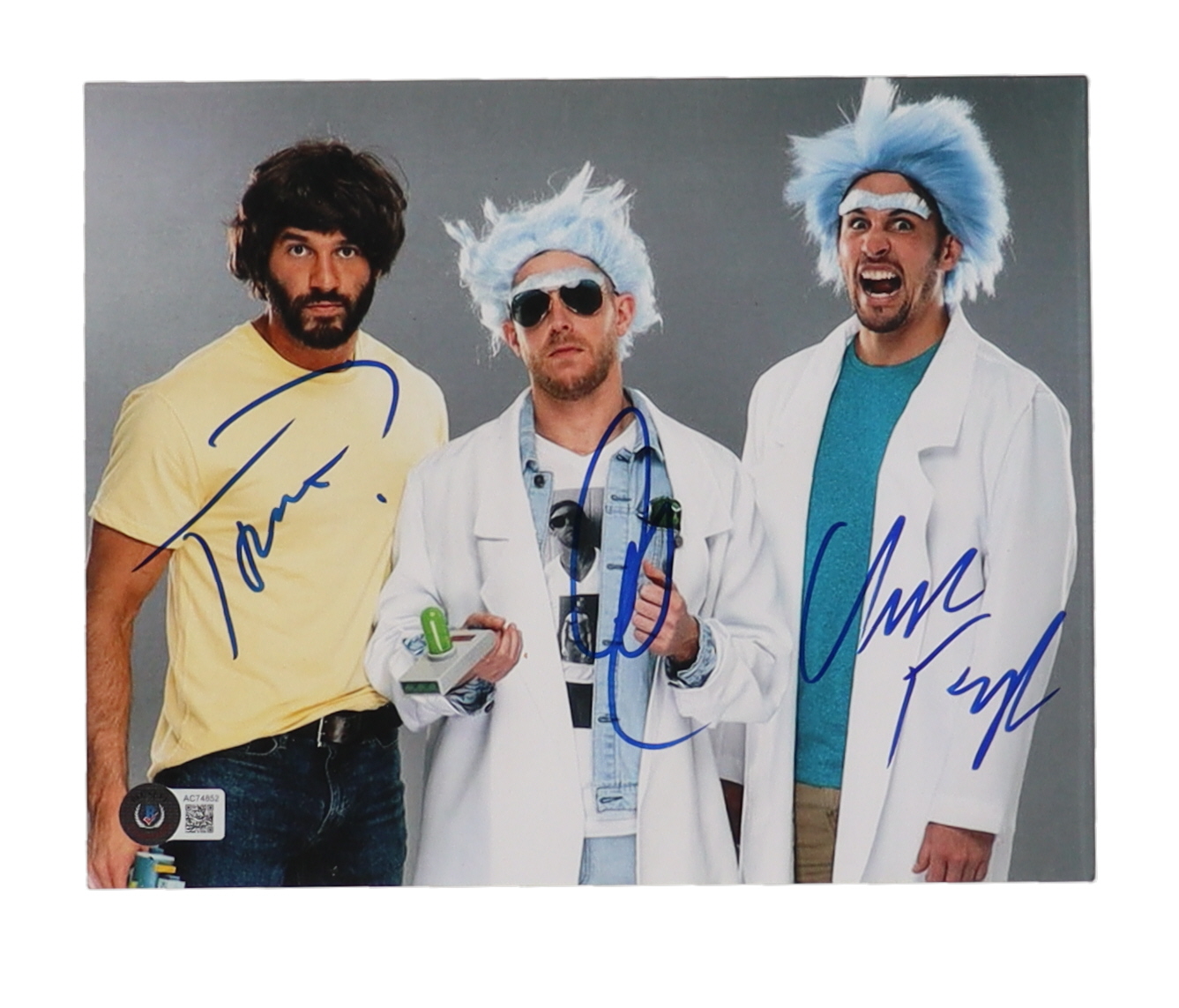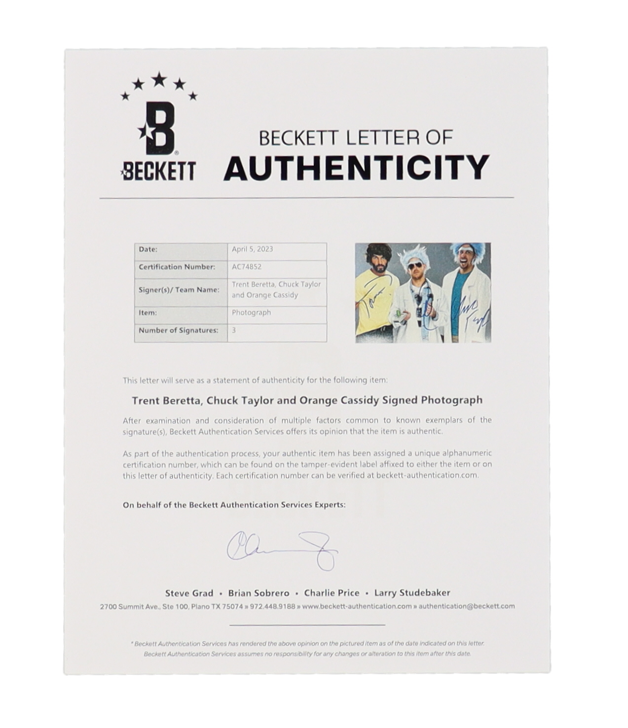 Photo measures 8" x 10" in size and has been hand-signed by Trent Beretta, Chuck Taylor and Orange Cassidy.
