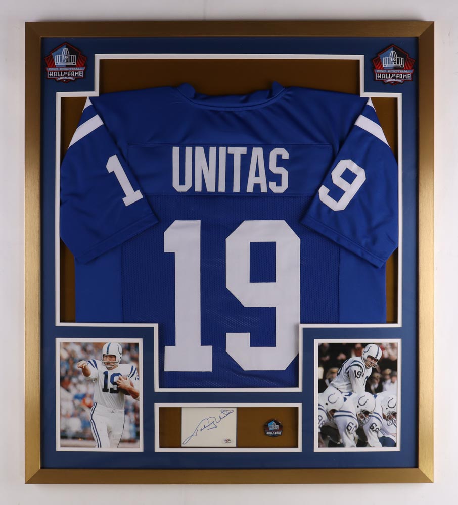 Johnny Unitas Signed Colts Custom Framed Cut Display with Jersey & Hall of Fame Pin (PSA)