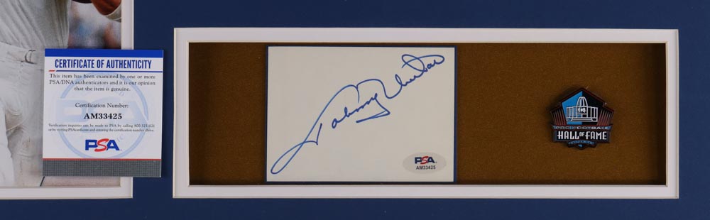 Custom frame measures approximately 32" x 36" in size and and features a cut that has been hand-signed by Johnny Unitas (D. 2002, Baltimore Colts, HOF), as well as an unsigned jersey and official Hall of Fame pin.