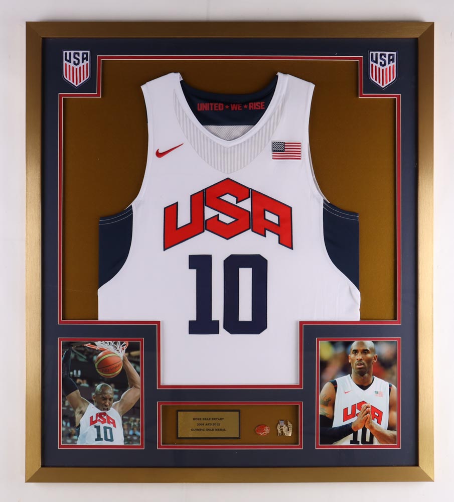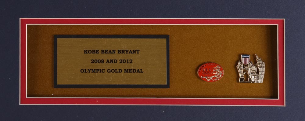 Custom frame measures approximately 32" x 36" in size and and features an unsigned Kobe Bryant jersey, as well as (2) Olympics pins (Team USA).