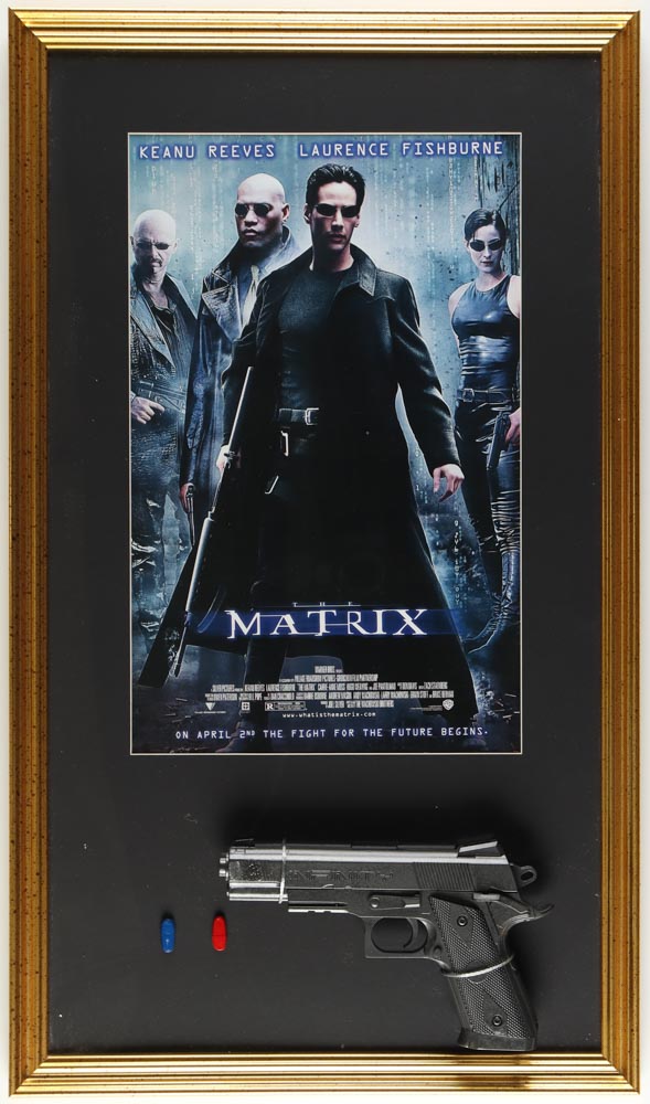 Custom frame measures 17" x 28" in size and features an unsigned print, a prop pistol and prop pills from the movie "The Matrix". See photos for more details.