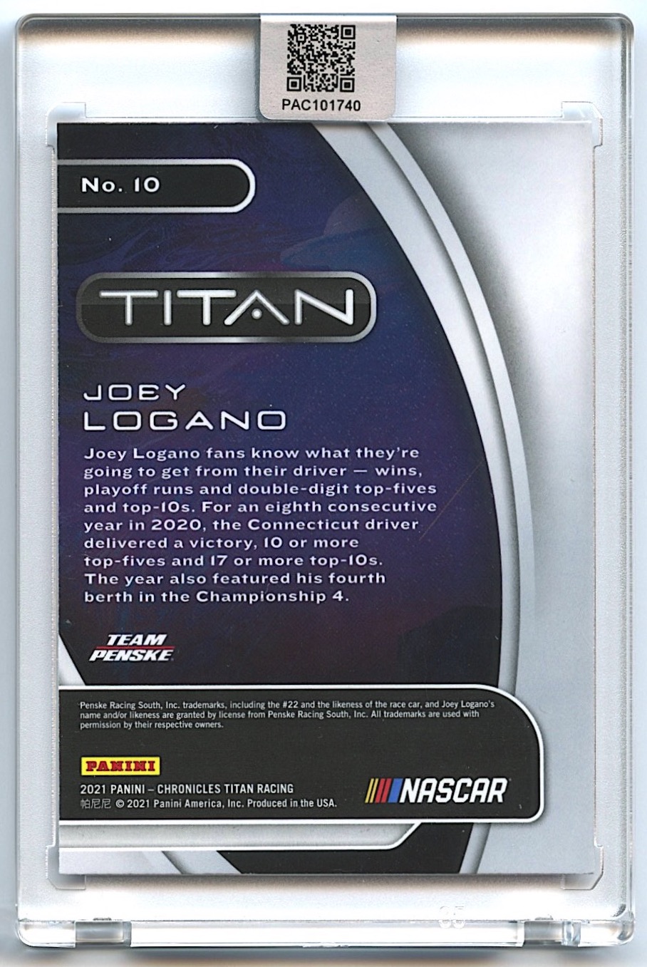 Joey Logano Signed 2021 Panini Chronicles Titan #10 (PA Encapsulated)