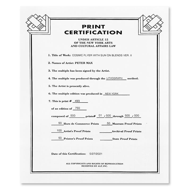 "Cosmic Flyer With Sun on Blends Ver II" is a limited edition lithograph on paper by Peter Max, numbered 493/500 and hand-signed by the artist. This piece comes framed. Includes Certificate of Authenticity from Peter Max Studios. Measures approximately 28" x 32" (frame), 13" x 17" (image).