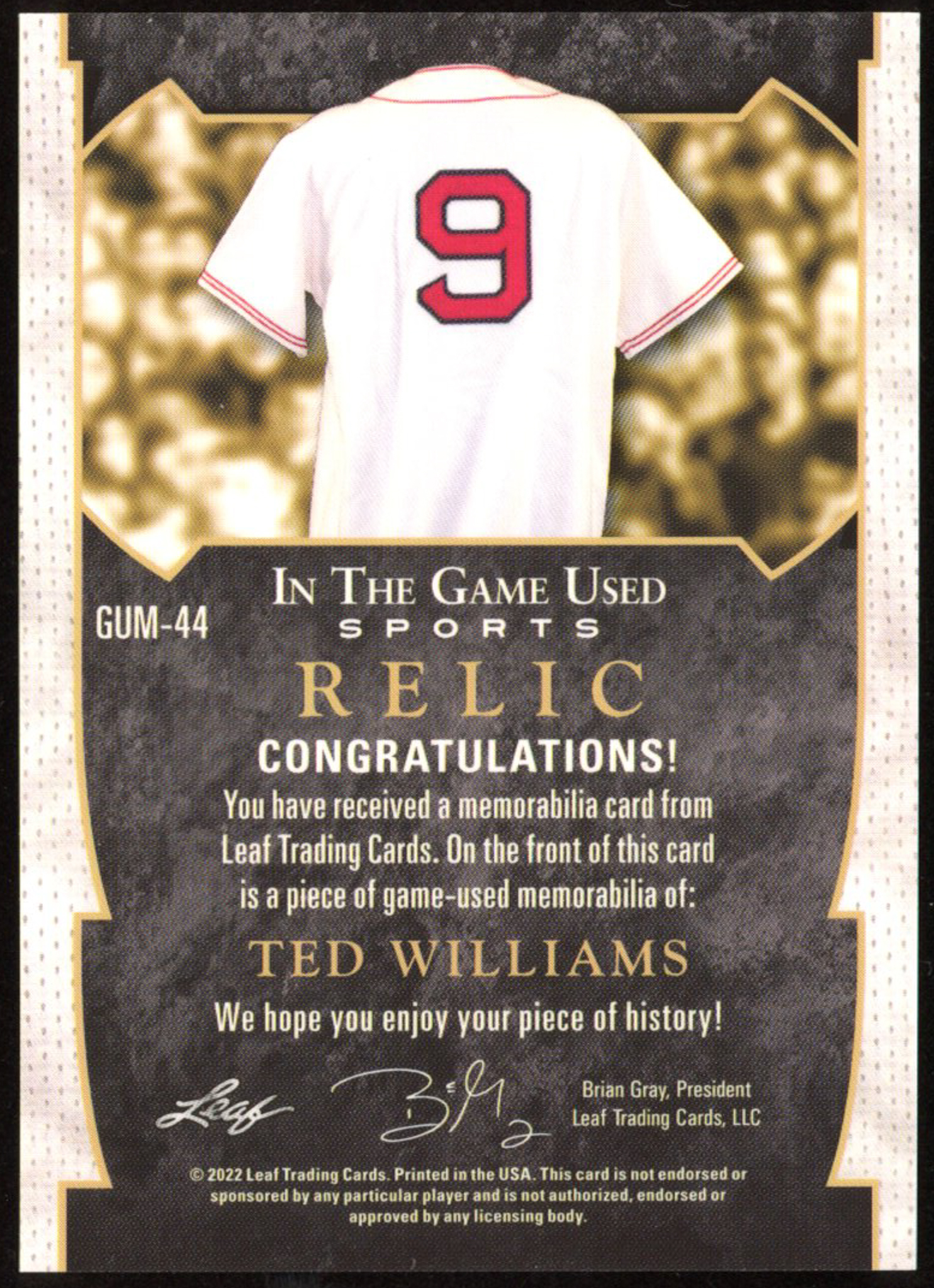 Ted Williams 2022 Leaf In the Game Used Sports Relic Memorabilia Silver #GUM44 #6/9