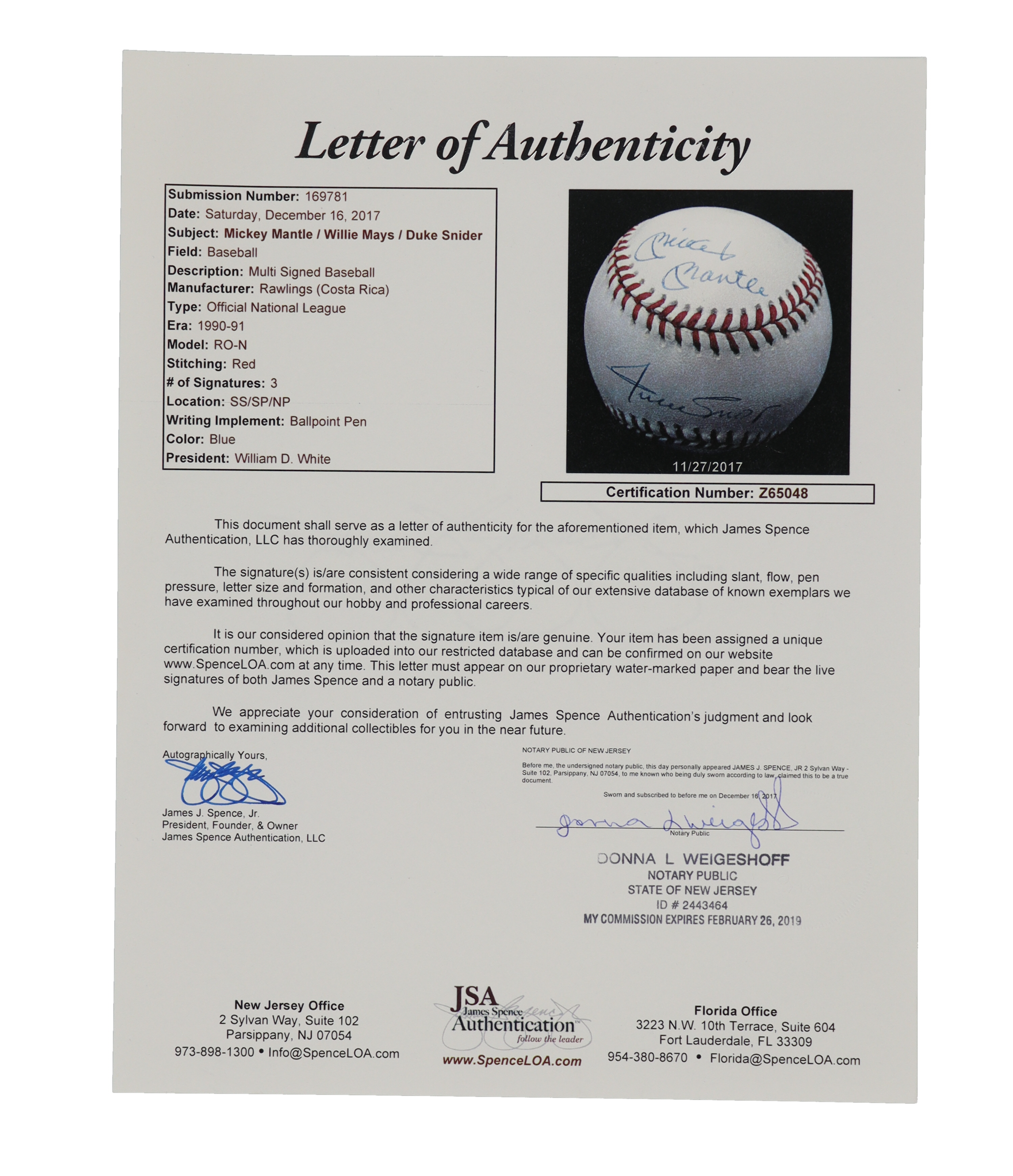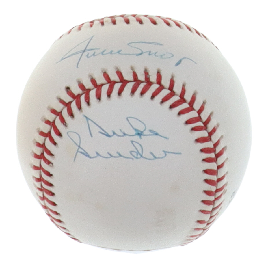 Rawlings Official National League baseball. Hand-signed by Mickey Mantle (D. 1995, New York Yankees, HOF), Willie Mays (San Francisco Giants, HOF), and Duke Snider (D. 2011, Brooklyn Dodgers, HOF).