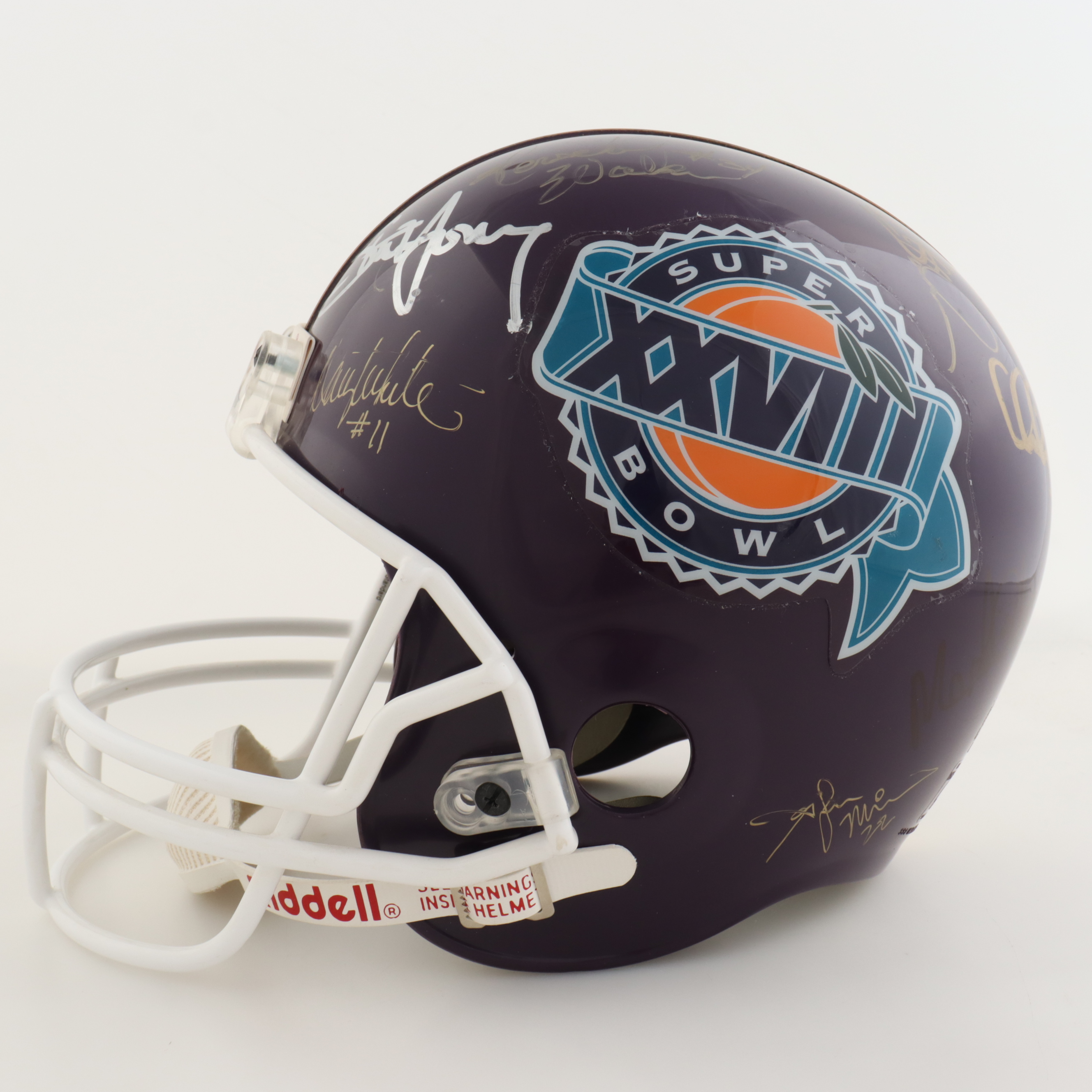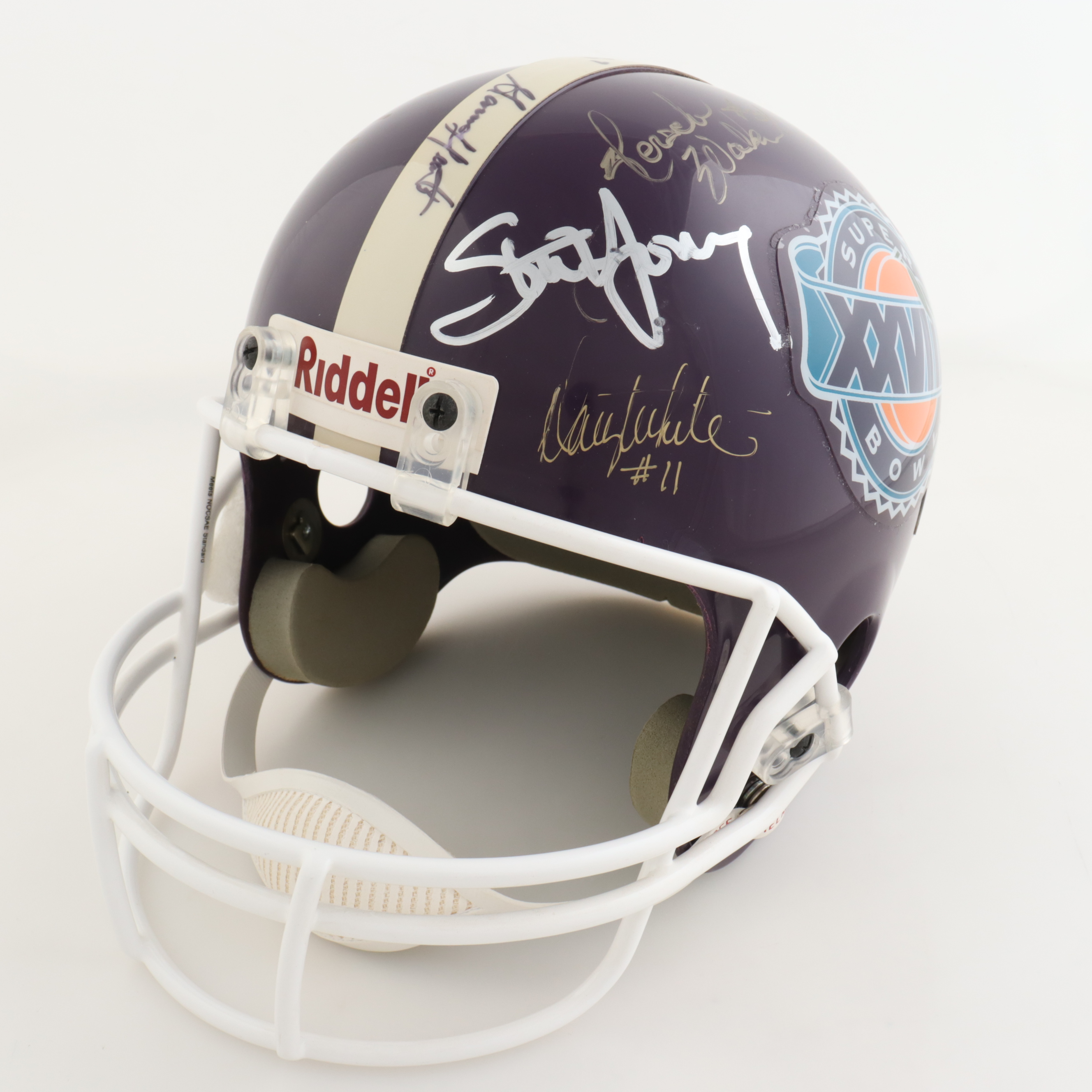 Riddell full-size authentic, on-field football helmet has been hand-signed by (16) with Steve Young, Deion Sanders, Morten Andersen, John Elway, Tim Brown, Jerome Bettis, Chris Carter, Garrison Hearts, Drew Bledsoe, Neil O'Donnell, Trent Dilfer, Michael Cofer, Herschel Walker, Ray Childress, Danny White and (1) other.