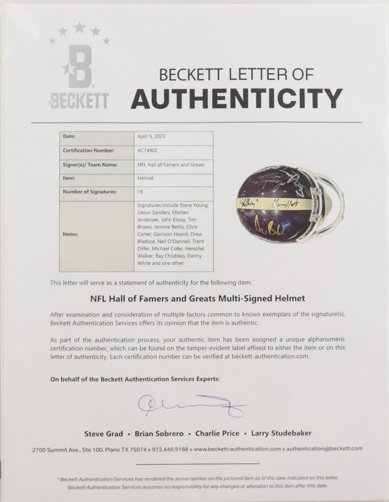 NFL Hall of Famers & Greats Full-Size Authentic On-Field Football Helmet Signed by (16) with Steve Young, Deion Sanders, Morten Andersen, John Elway (Beckett)