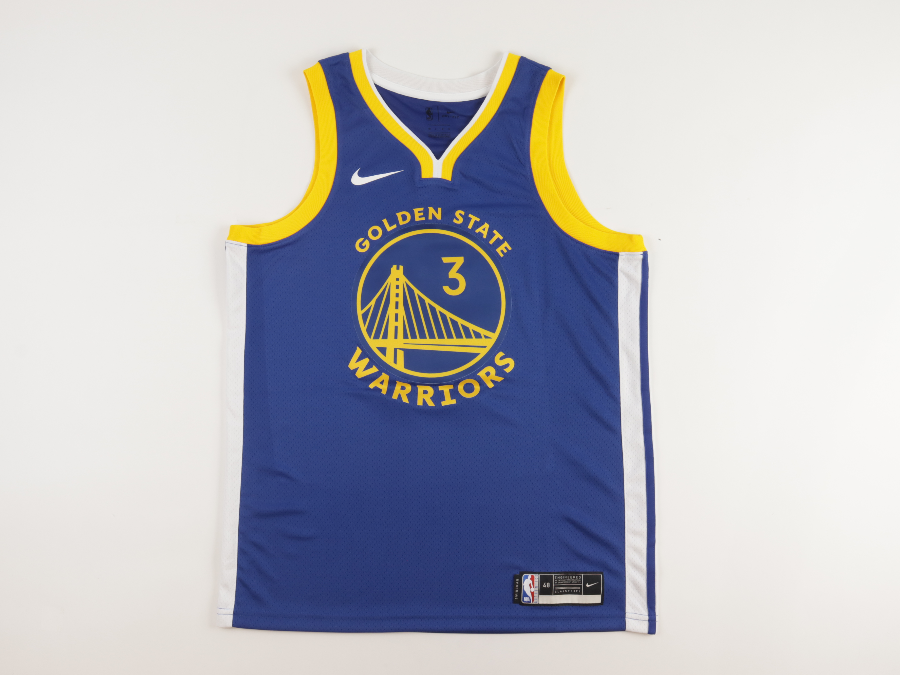 Nike jersey. Everything is printed on, size 48. Has been hand-signed by Jordan Poole (Golden State Warriors).