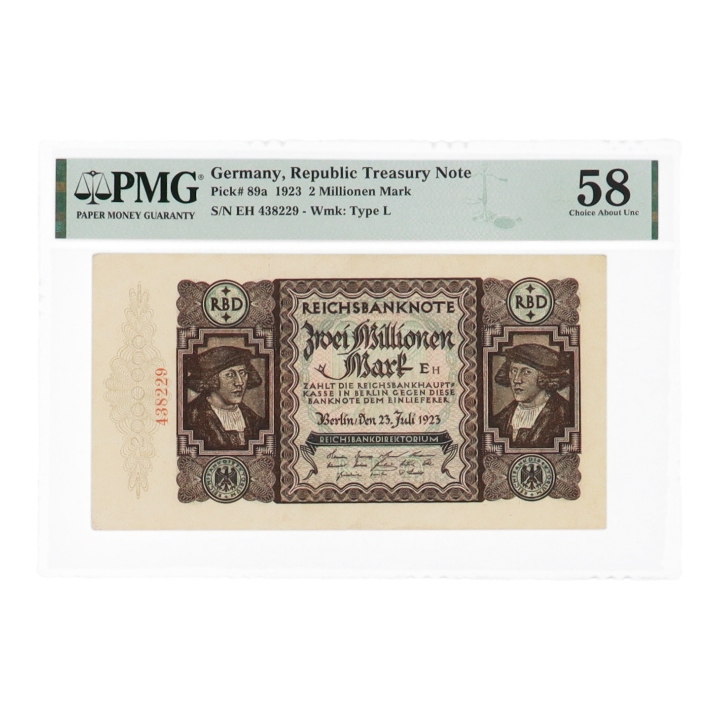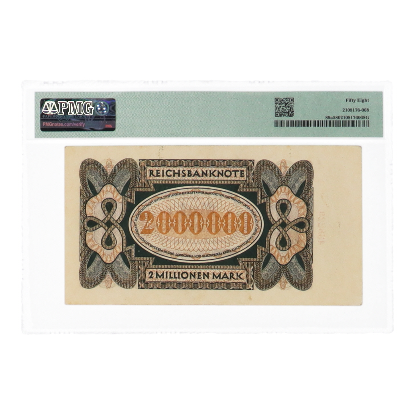 1923 Germany 2 Millionen Mark Republic Treasury Note (PMG Choice AU 58)