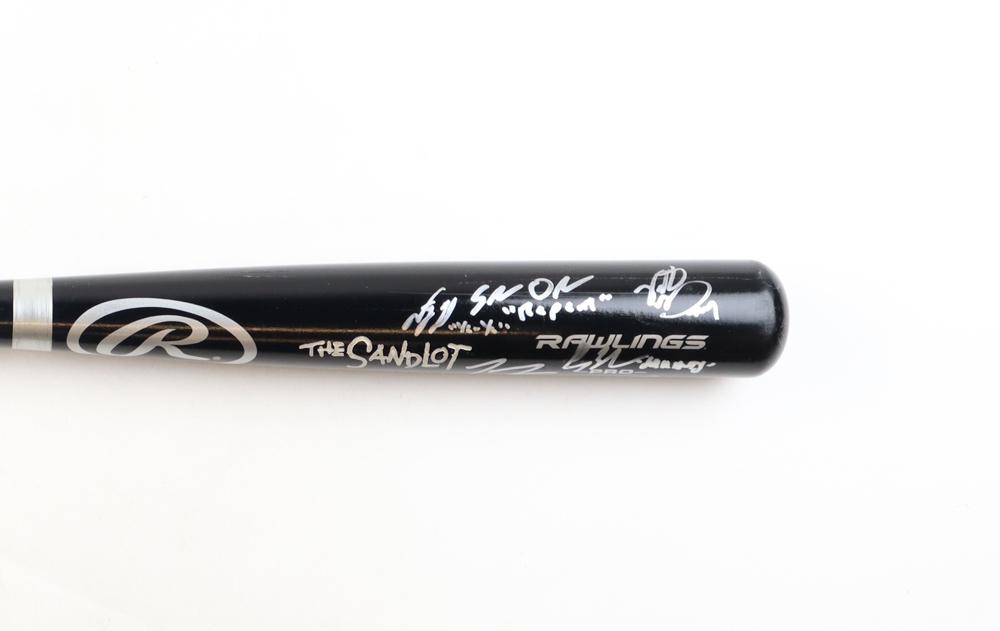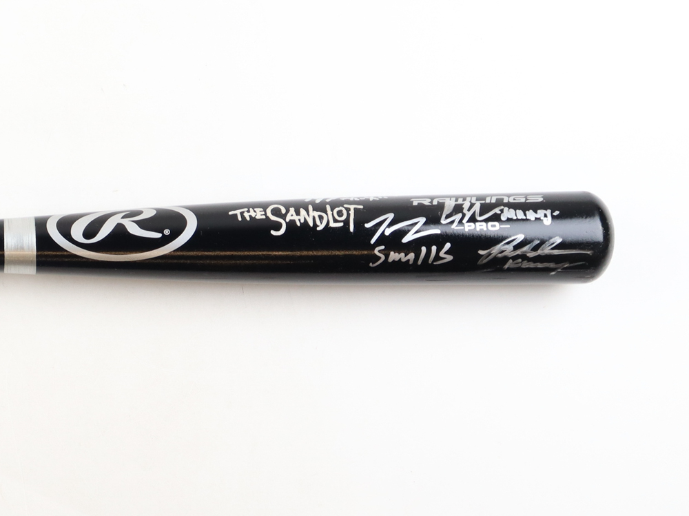 Rawlings Pro baseball bat with "The Sandlot" engraving. Hand-signed and inscribed by (6) cast memebers including Tom Guiry (Scotty Smalls), Chauncey Leopardi (Michael "Squints" Palledorous), Marty York (Alan "Yeah-Yeah" McClennan), Shane Obedzinski (Tommy "Repeat" Timmons), Victor DiMattia (Timmy Timmons), and Brandon Adams (Kenny DeNunez).
