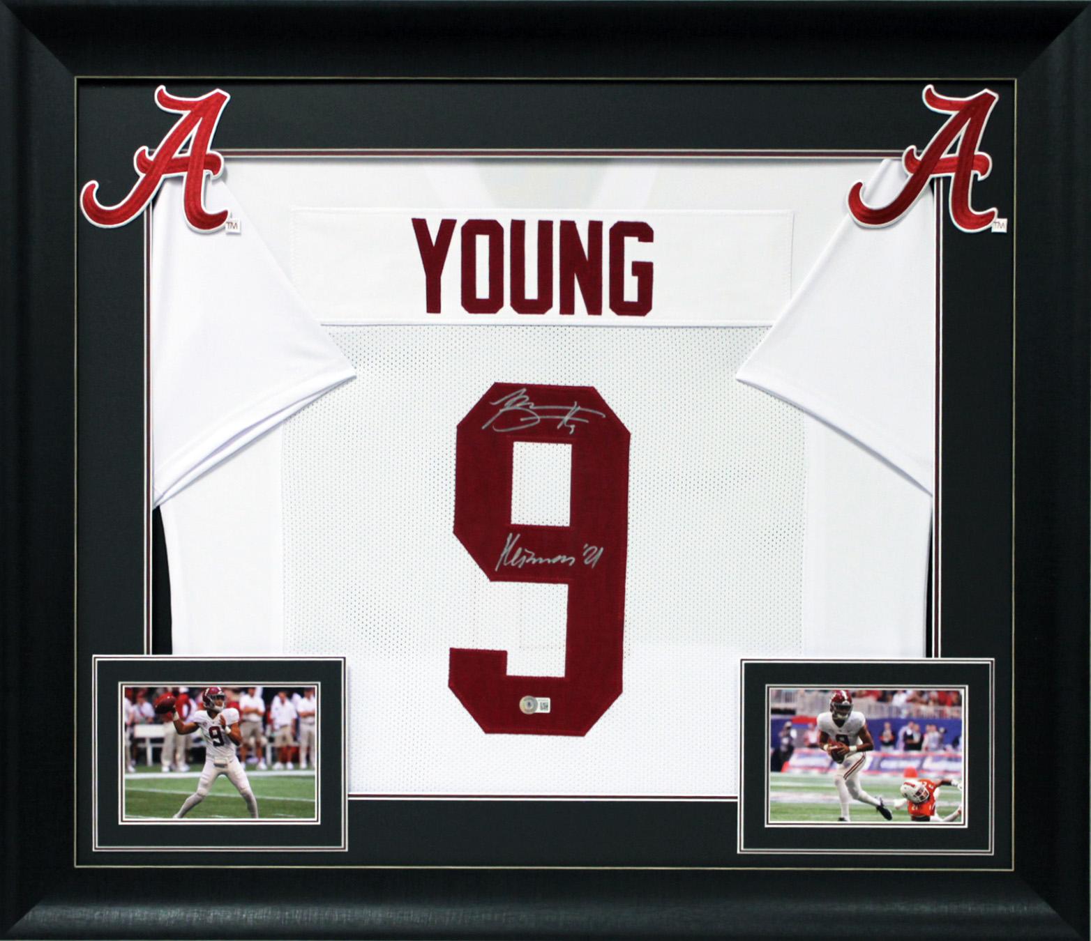 Custom frame measures 32" x 37" in size and features a jersey that has been hand-signed and inscribed by Bryce Young.