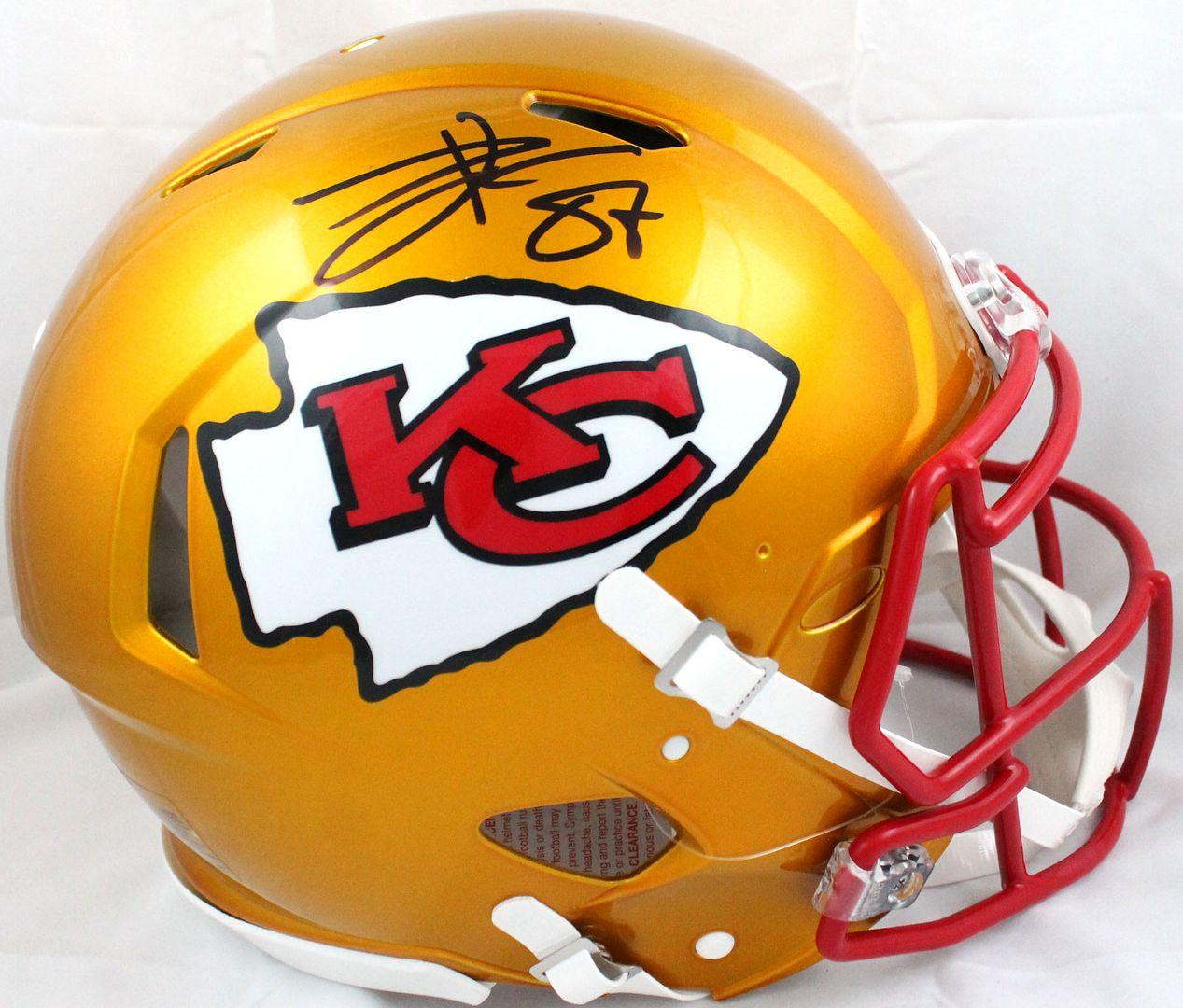 Riddell Kansas City Chiefs full-size authentic on-field Flash Alternate Speed helmet. Hand-signed by Travis Kelce.