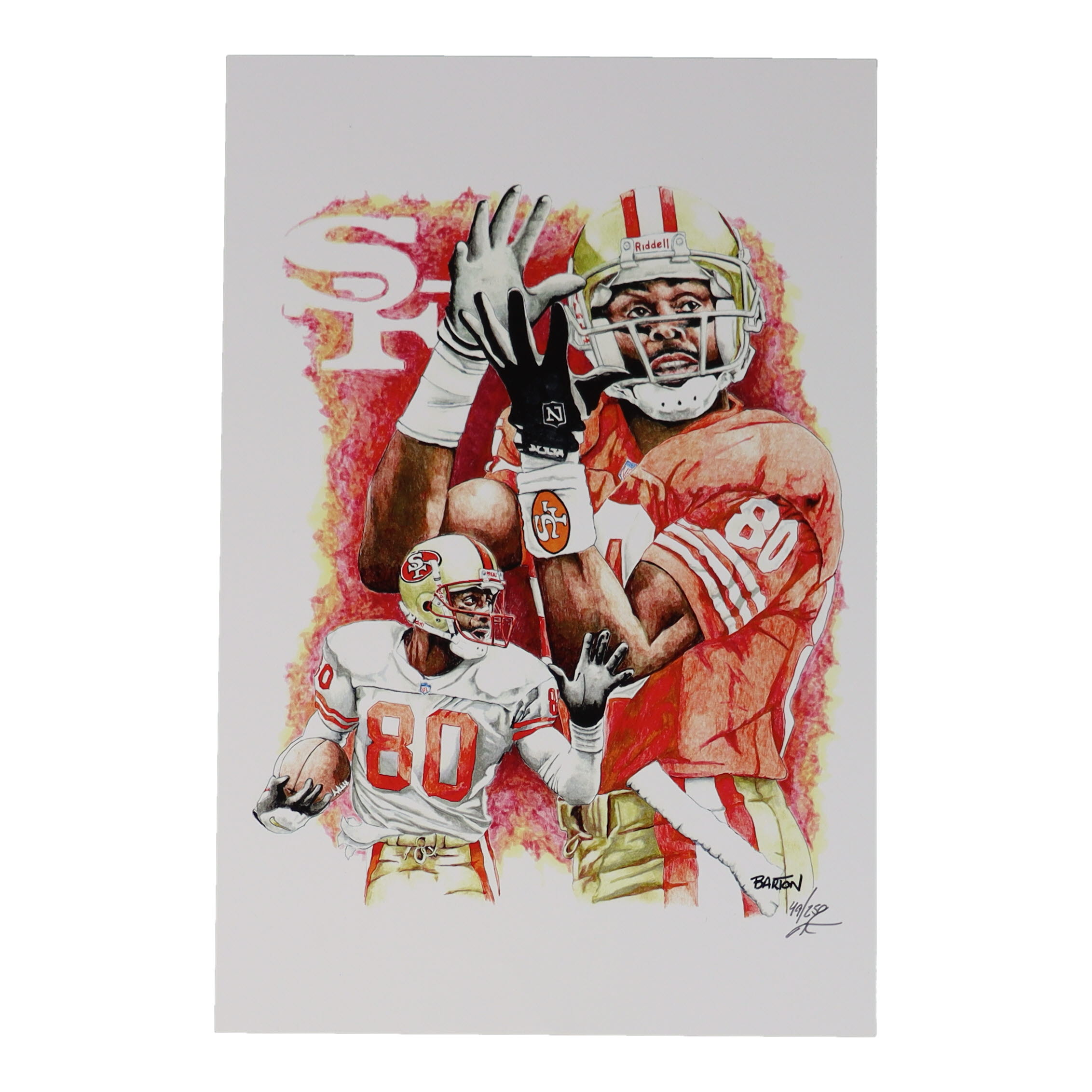 This limited edition giclee on high-quality matte fine art smooth 230gsm paper measures approximately 12" x 18" in size. The piece is hand-signed and numbered by the artist, Brian Barton and features Jerry Rice (San Francisco 49ers, HOF).