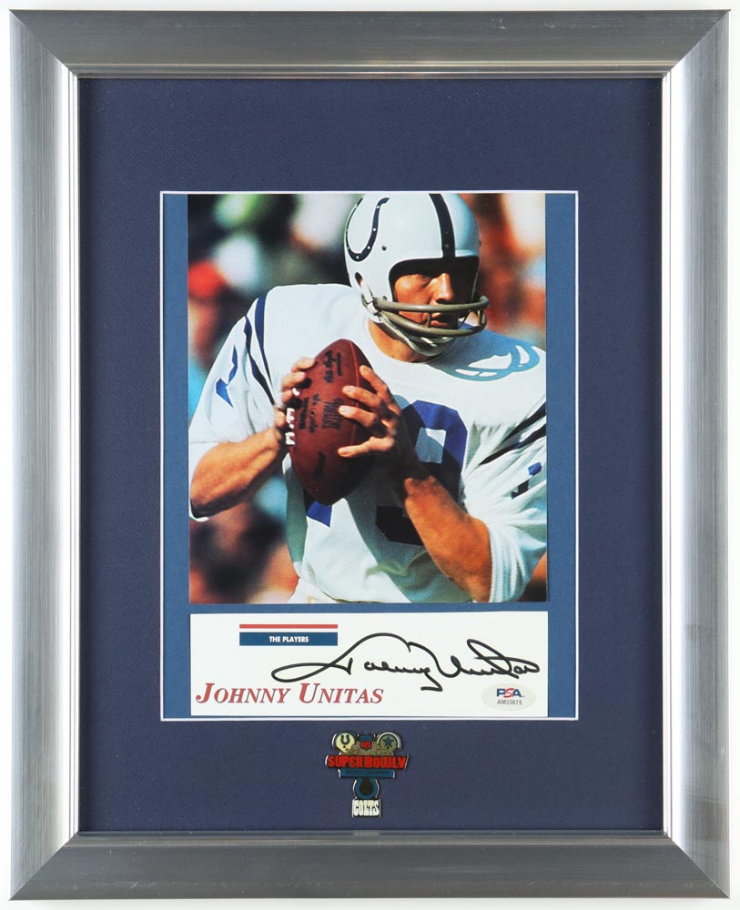 Johnny Unitas Signed Custom Framed Photo Display with Super Bowl LV Champions Pin (PSA)