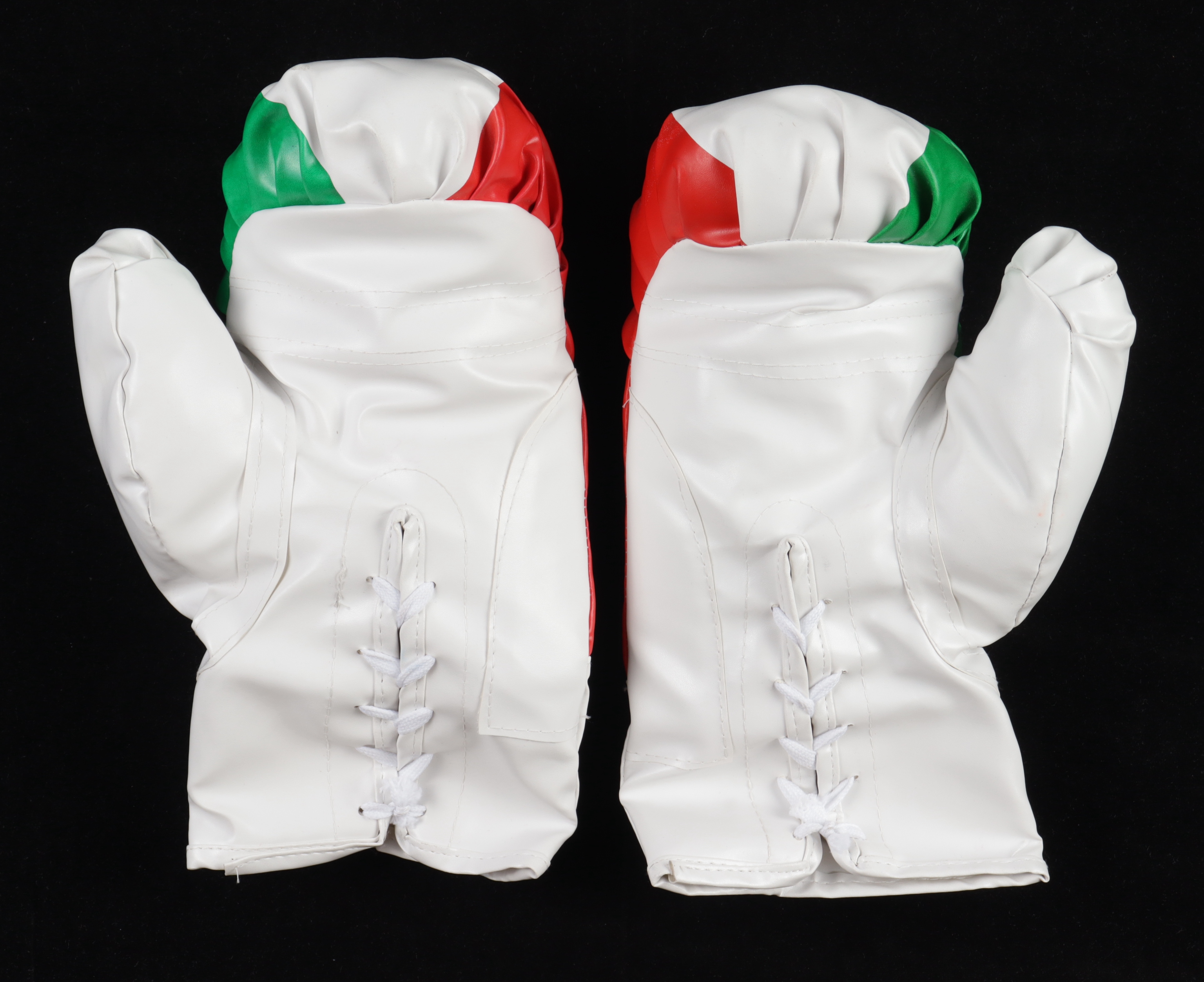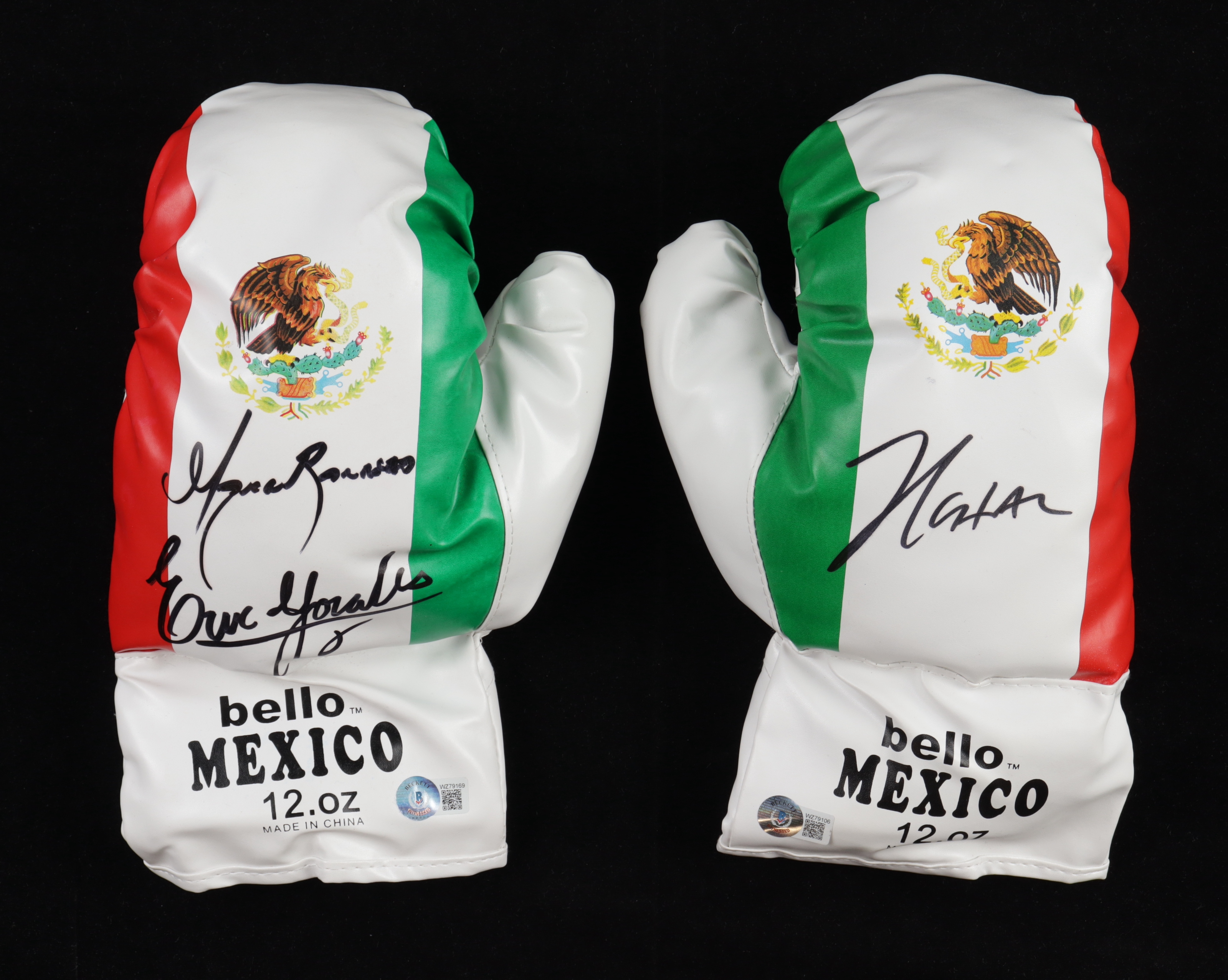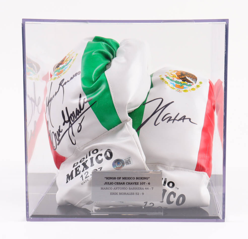 Pair of Mexico boxing gloves. Gloves have been hand-signed by Marco Antonio Barrera, Julio Cesar Chavez and Erik Morales. Please note, the display case is included as shown.