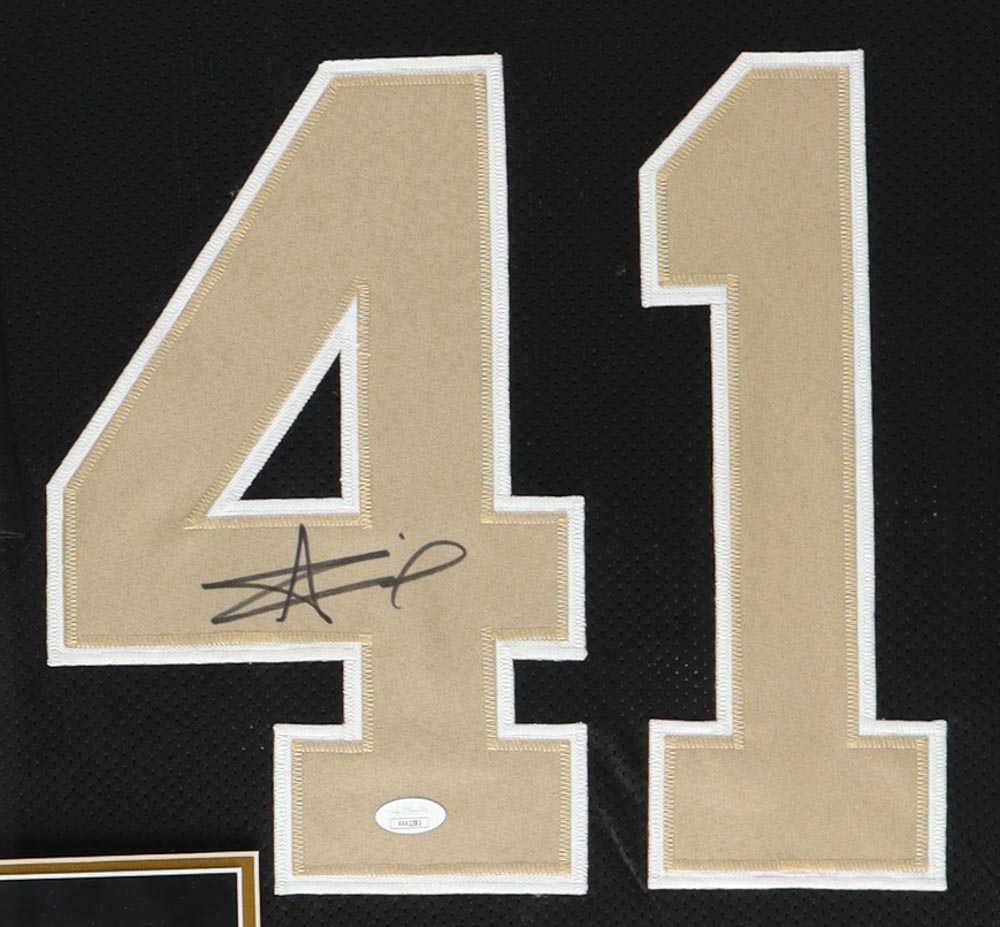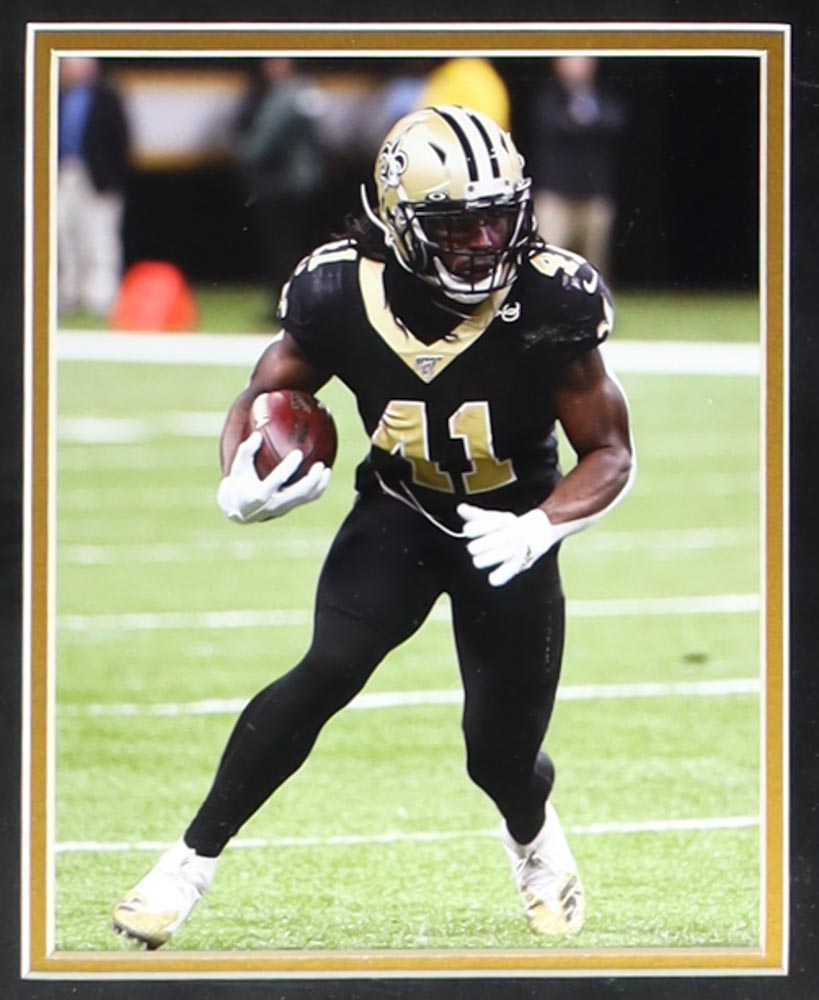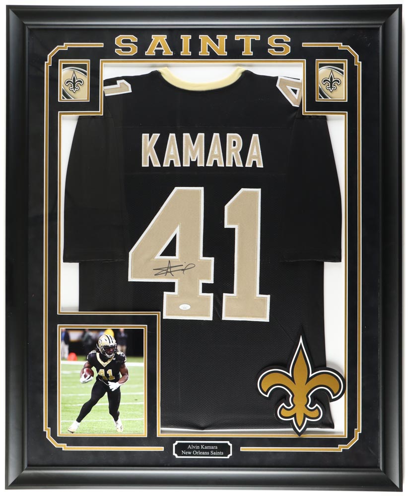 Custom framed display measures 36" x 44" in size and features a custom on-field style jersey that has been hand-signed by Alvin Kamara (New Orleans Saints).