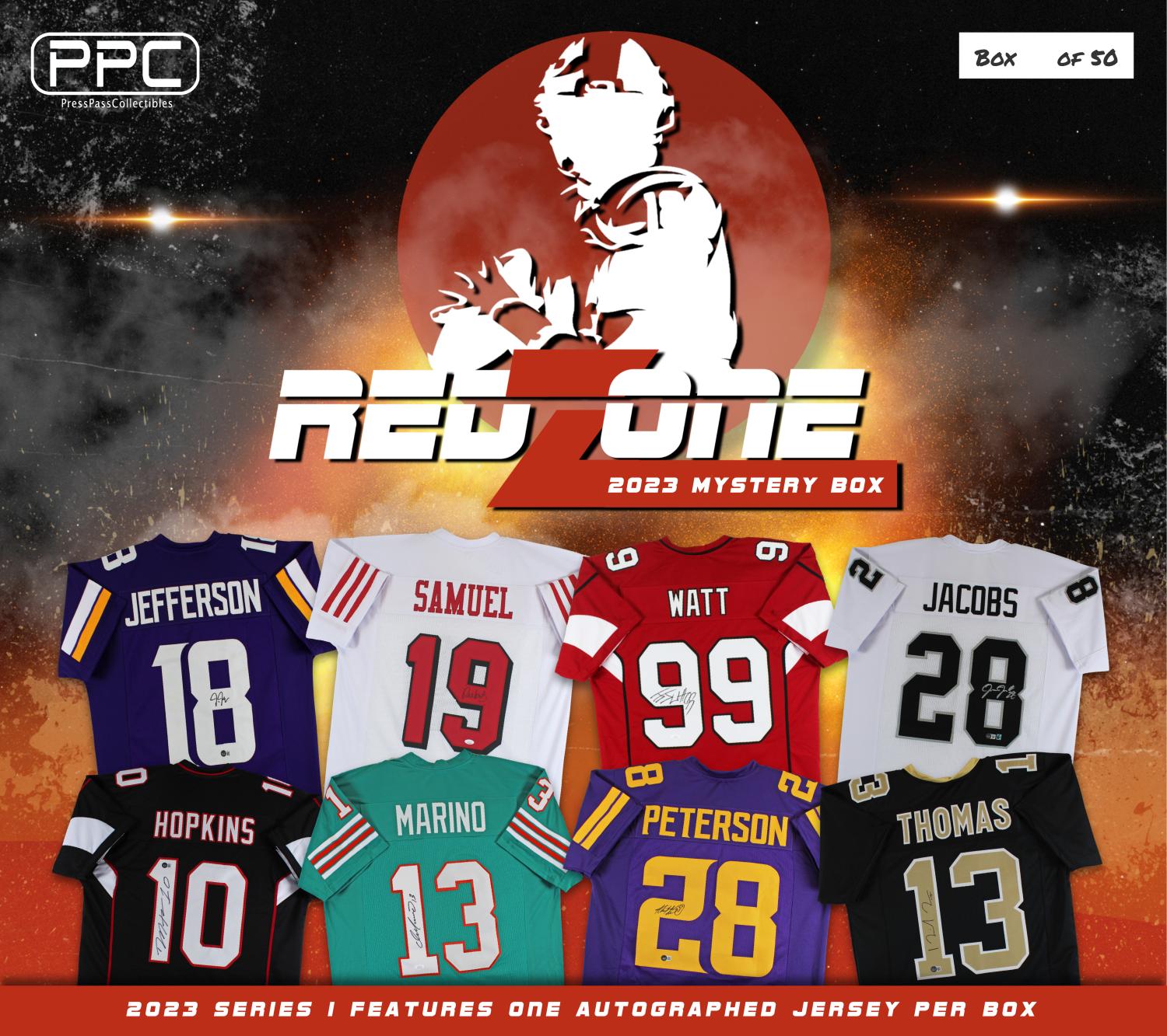 The Press Pass Collectibles 2023 redzone football jersey mystery box includes one (1) custom jersey from your favorite NFL teams. Some boxes will feature jerseys signed by DeAndre Hopkins, Josh Jacobs, Adrian Peterson, J.J. Watt, and many more Stars / Hall of Famers!