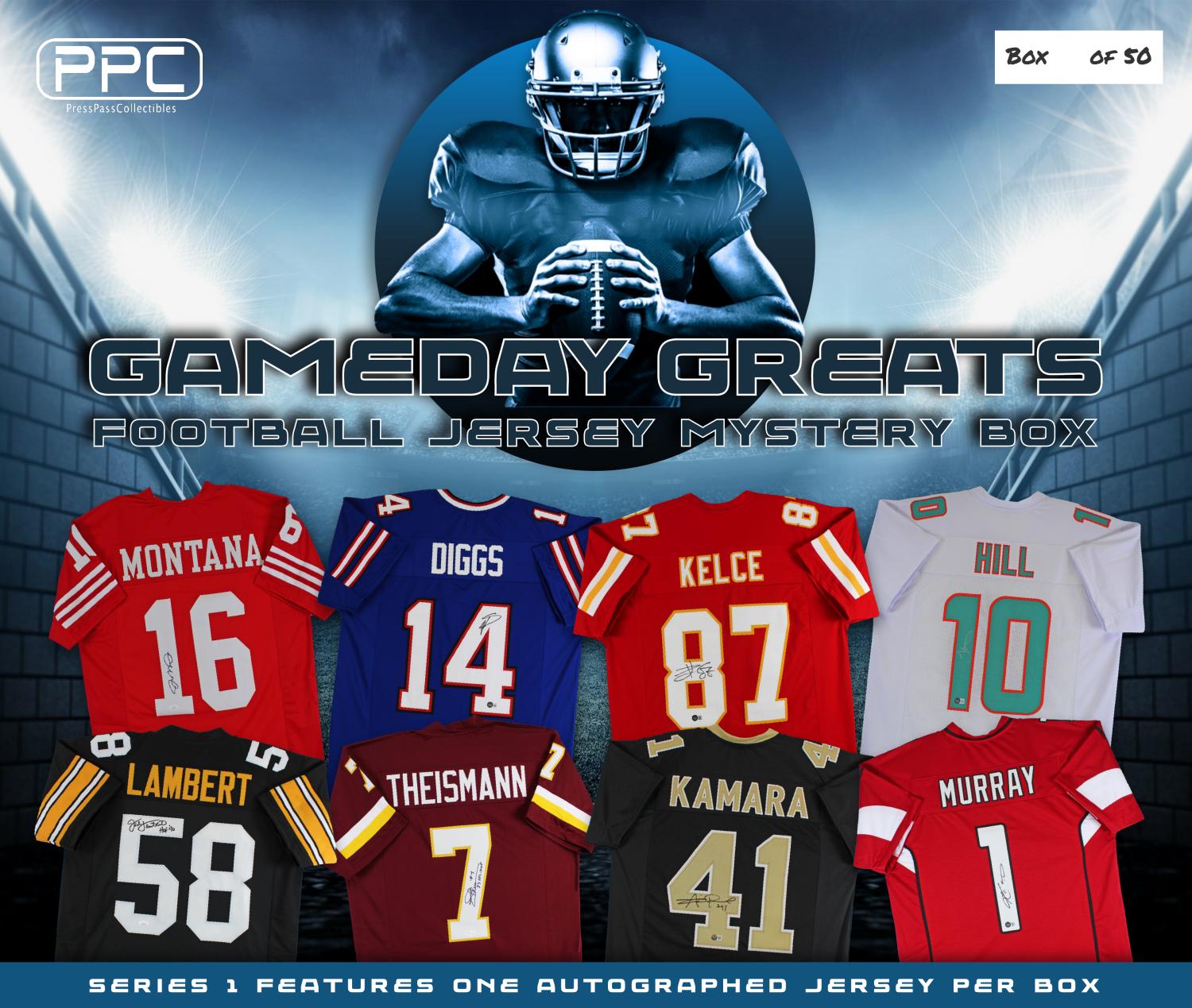The Press Pass Collectibles 2023 gameday greats football jersey mystery box includes one (1) custom jersey from your favorite NFL teams. Some boxes will feature jerseys signed by Joe Montana, Tyreek Hill, Joe Theismann, Alvin Kamara, and many more Stars / Hall of Famers!