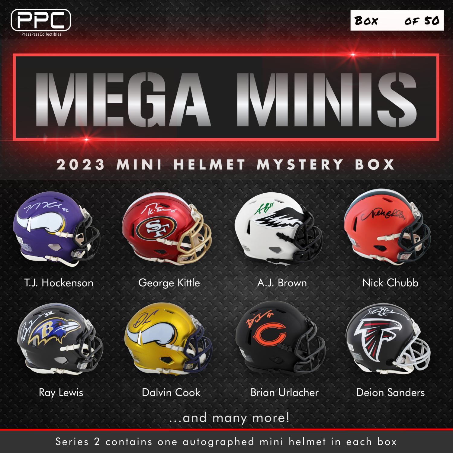 The Press Pass Collectibles 2023 mega mini helmet mystery box includes one (1) mini helmet from your favorite NFL teams. Some boxes will feature mini helmets signed Deion Sanders, Ray Lewis, Dalvin Cook, Brian Urlacher, and many more!