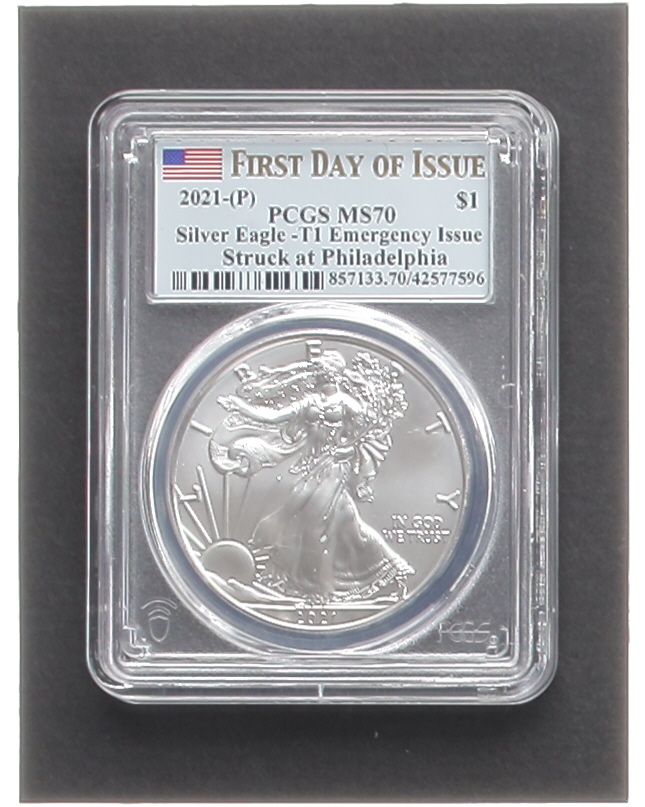 2021-(P) American Eagle - T1 Emergency Issue - Struck at Philadelphia - First Day of Issue Label Silver Dollar (PCGS MS70)