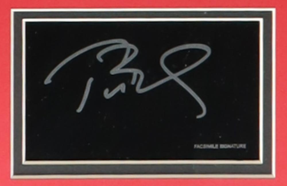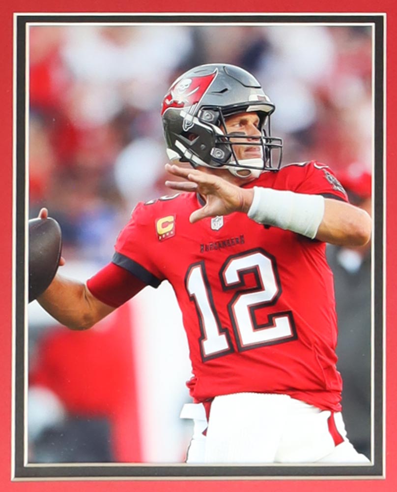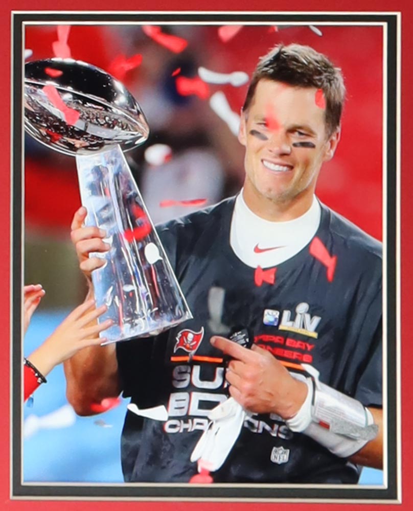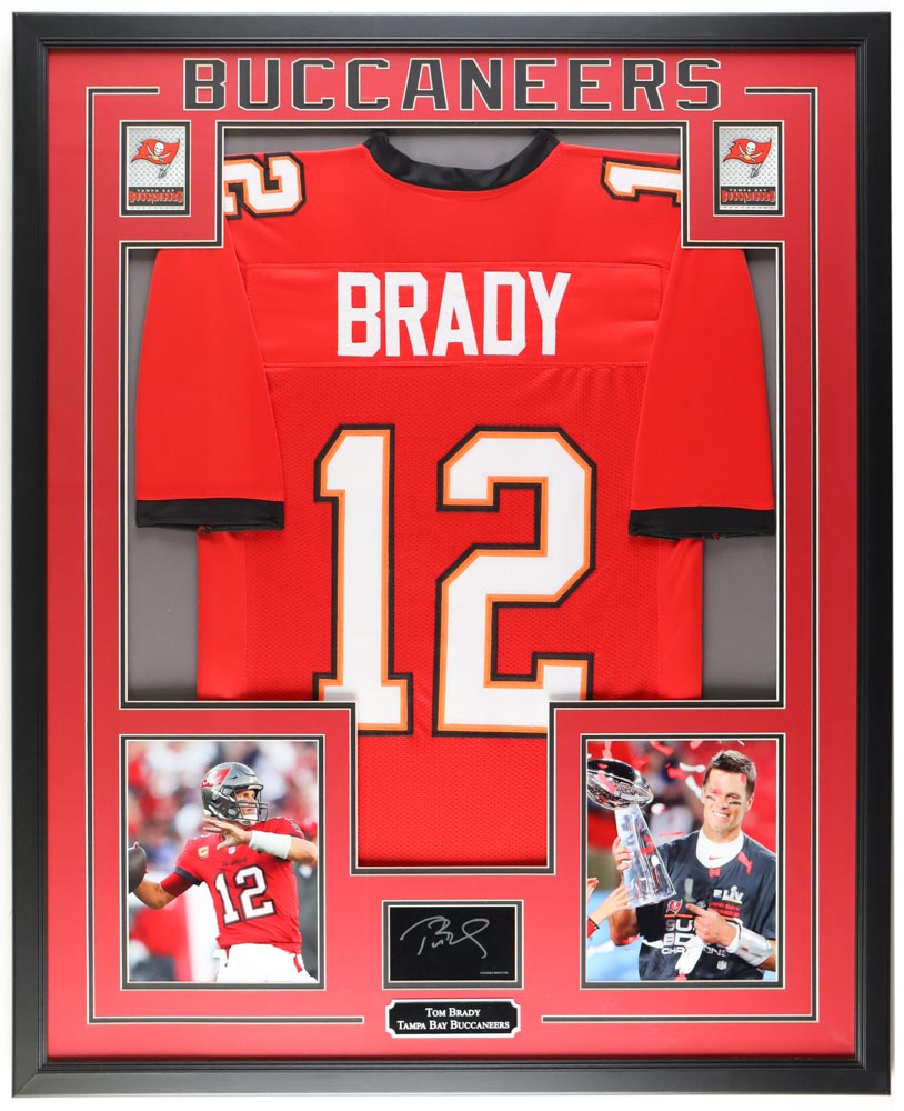 Custom framed jersey display measures 35" x 43" in size and features a Tom Brady cut (facsimile signature) as well as an unsigned jersey.