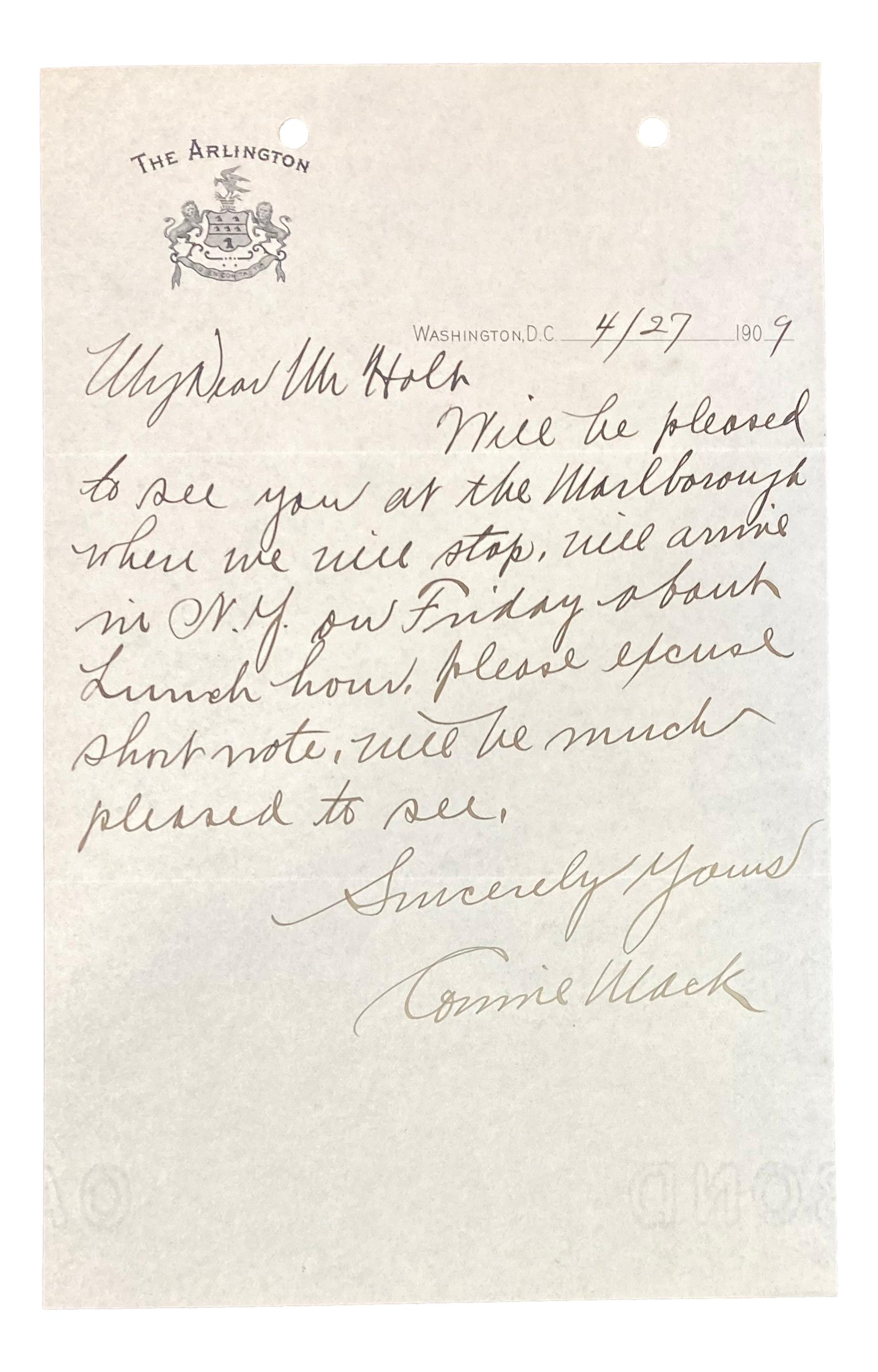 Hand-written letter has been hand-signed by Connie Mack (D. 1956, Philadelphia Athletics, HOF).