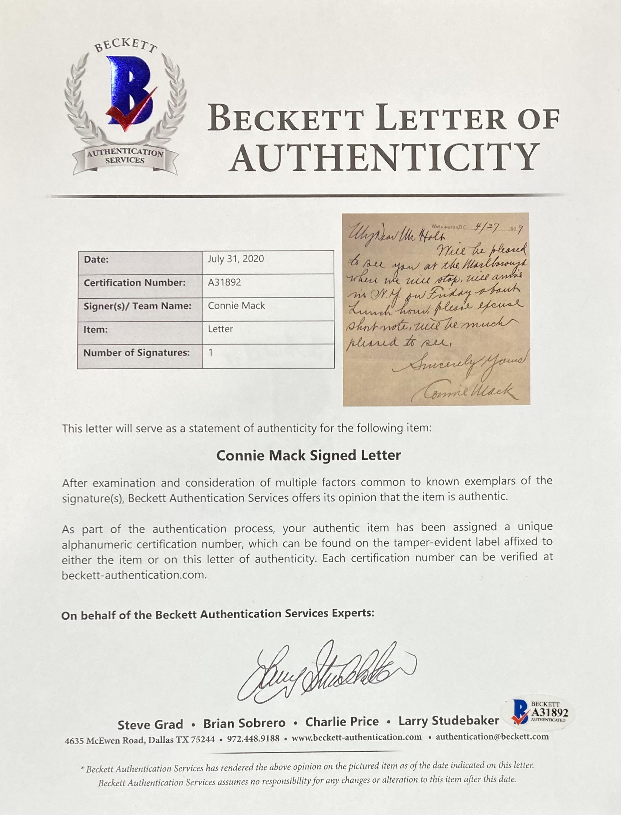 Connie Mack Signed Hand-Written Letter (Beckett)