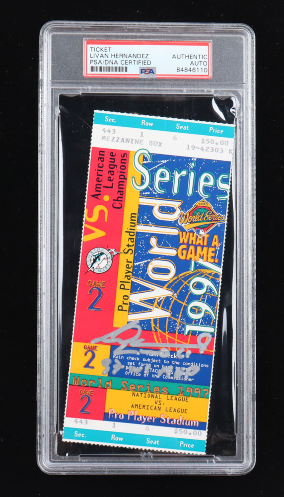 World Series Game 2 ticket has been hand-signed and inscribed by Liván Hernández (Florida Marlins).