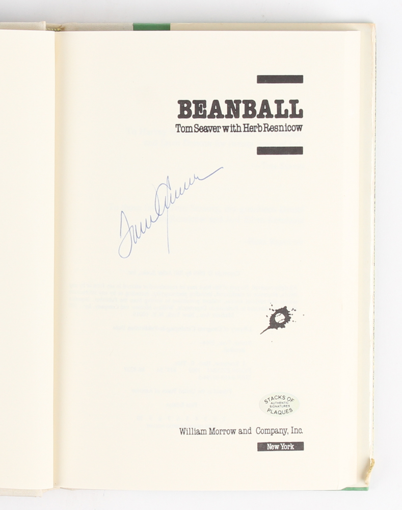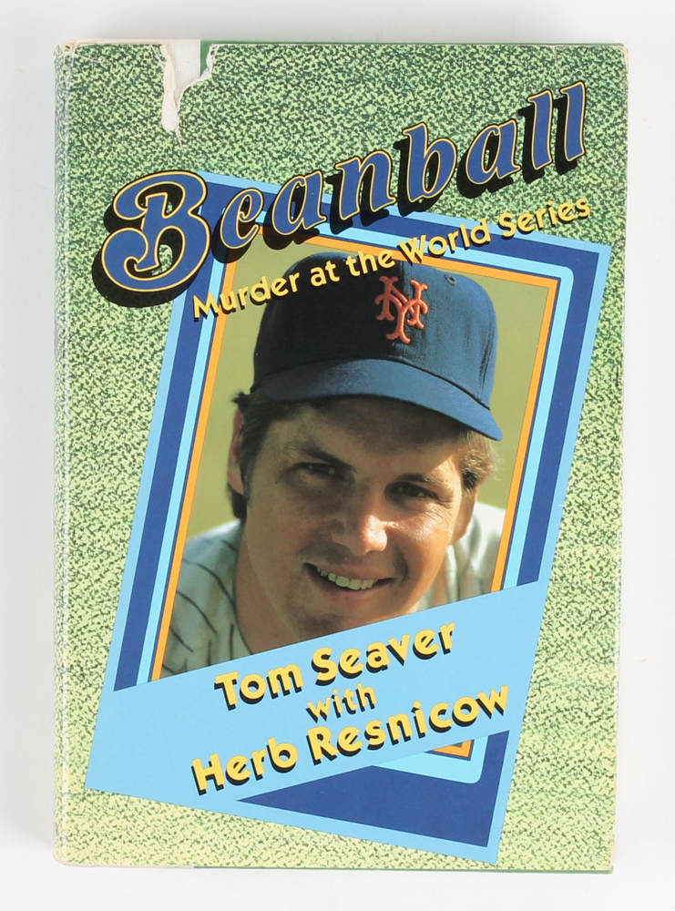 "Beanball" hardcover book hand-signed in blue ink pen on the cover page by Tom Seaver (Mets HOF). Please note the book jacket shows signs of wear and has a tear. See photos for details.